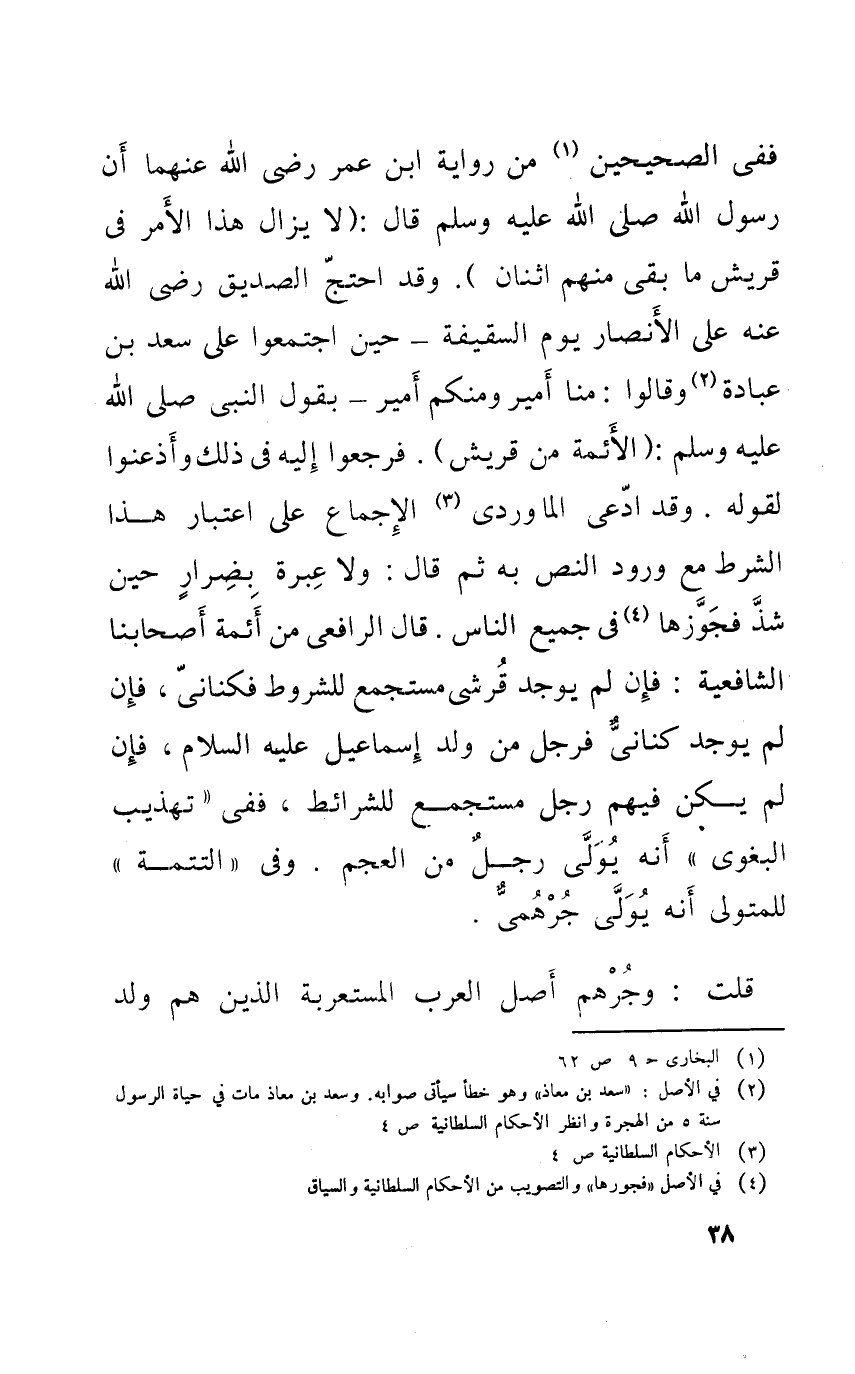 فَفِي الصَّحِيحَيْنِ من رِوَايَة ابْن عمر رضى الله عَنْهُمَا أَن رَسُول الله صلى الله عَلَيْهِ وَسلم قَالَ لَا يزَال هَذَا الْأَمر فِي قُرَيْش مَا بقى مِنْهُم اثْنَان وَقد احْتج الصّديق رضى الله عَنهُ على الْأَنْصَار يَوْم السَّقِيفَة حِين اجْتَمعُوا على سعد بن عبَادَة وَقَالُوا منا أَمِير ومنكم أَمِير بقول النَّبِي صلى الله عَلَيْهِ وَسلم الْأَئِمَّة من قُرَيْش فَرَجَعُوا إِلَيْهِ فِي ذَلِك وأذعنوا لقَوْله وَقد ادّعى الماوردى الْإِجْمَاع على اعْتِبَار هَذَا الشَّرْط مَعَ وُرُود النَّص بِهِ ثمَّ قَالَ وَلَا عِبْرَة بضرار حِين شَذَّ فجوزها فِي جَمِيع النَّاس قَالَ الرَّافِعِيّ من أَئِمَّة أَصْحَابنَا الشَّافِعِيَّة فَإِن لم يُوجد قرشى مستجمع للشروط فكنانى فَإِن لم يُوجد كنانى فَرجل من ولد إِسْمَاعِيل عَلَيْهِ السَّلَام فَإِن لم يكن فيهم رجل مستجمع للشرائط فَفِي تَهْذِيب البغوى أَنه يُولى رجل من الْعَجم وفى التَّتِمَّة للمتولى أَنه يُولى جرهمي