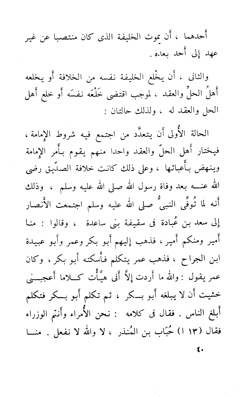 الْحَالة الأولى أَن يَتَعَدَّد من اجْتمع فِيهِ شُرُوط الْإِمَامَة فيختار أهل الْحل وَالْعقد وَاحِدًا مِنْهُم يقوم بِأَمْر الْإِمَامَة وينهض بأعبائها وعَلى ذَلِك كَانَت خلَافَة الصّديق رضى الله عَنهُ بعد وَفَاة رَسُول الله صلى الله عَلَيْهِ وَسلم وَذَلِكَ أَنه لما توفّي النَّبِي صلى الله عَلَيْهِ وَسلم اجْتمعت الْأَنْصَار إِلَى سعد بن عبَادَة فِي سَقِيفَة بني سَاعِدَة وَقَالُوا منا أَمِير ومنكم أَمِير فَذهب إِلَيْهِم أَبُو بكر وَعمر وَأَبُو عُبَيْدَة ابْن الْجراح فَذهب عمر يتَكَلَّم فأسكته أَبُو بكر وَكَانَ عمر يَقُول وَالله مَا أردْت إِلَّا أَنى هيأت كلَاما أعجبني خشيت أَن لَا يبلغهُ أَبُو بكر ثمَّ تكلم أَبُو بكر فَتكلم أبلغ النَّاس فَقَالَ فِي كَلَامه نَحن الْأُمَرَاء وَأَنْتُم الوزراء فَقَالَ (13 أ) حباب بن الْمُنْذر لَا وَالله لَا نففعل منا