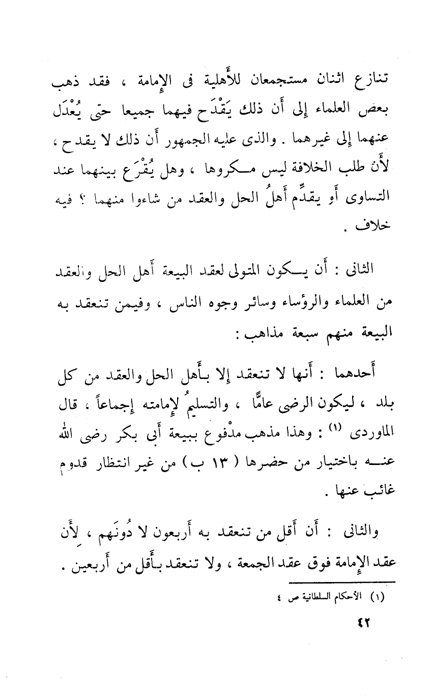 الثَّانِي أَن يكون المتولى لعقد الْبيعَة أهل الْحل وَالْعقد من الْعلمَاء والرؤساء وَسَائِر وُجُوه النَّاس وفيمن تَنْعَقِد بِهِ الْبيعَة مِنْهُم سَبْعَة مَذَاهِب