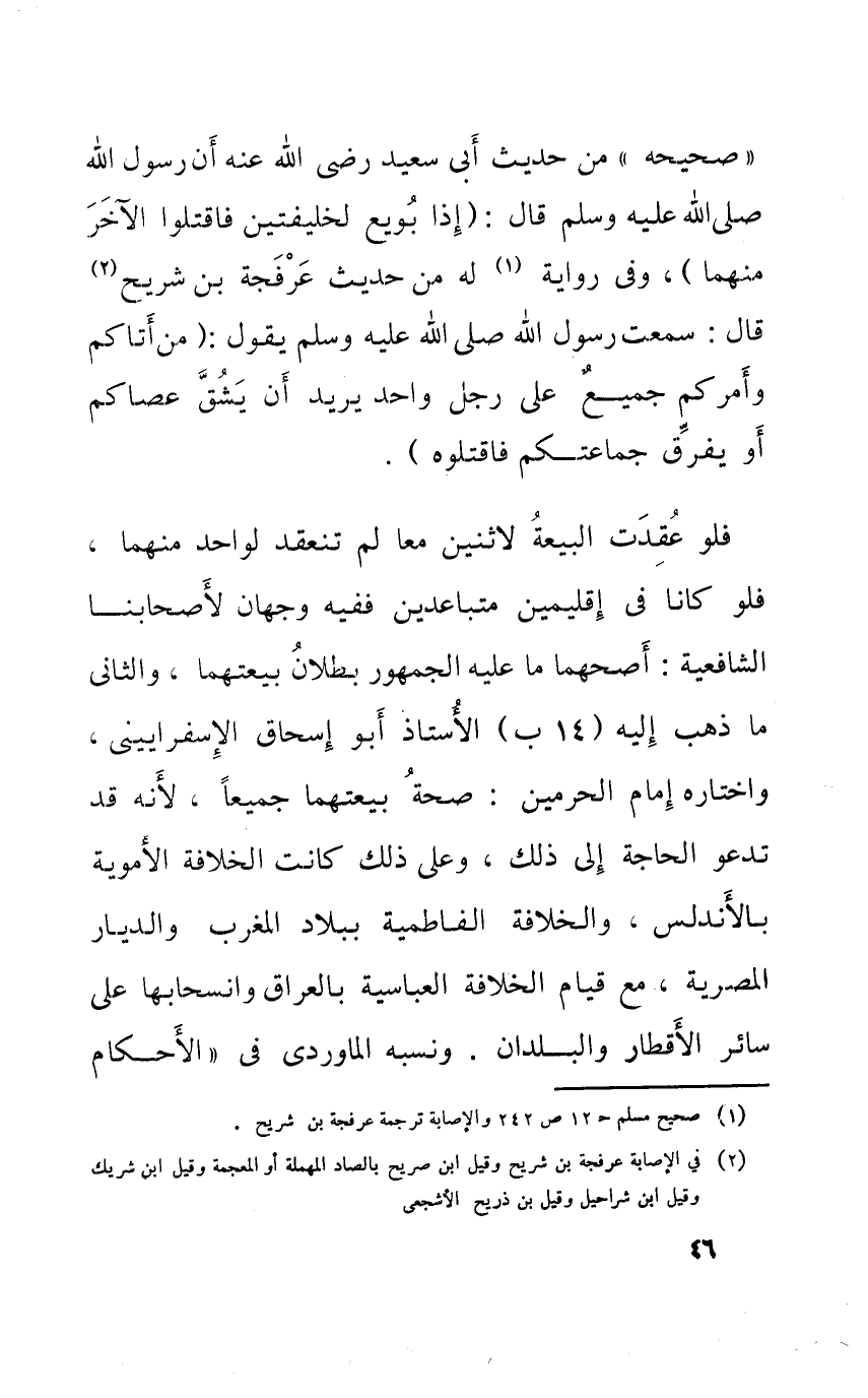 صَحِيحه من حَدِيث ابي سعيد رَضِي الله عَنهُ ان رَسُول الله صلى الله عَلَيْهِ وَسلم قَالَ اذا بُويِعَ لخليفتين فَاقْتُلُوا الآخر مِنْهُمَا وَفِي رِوَايَة لَهُ من حَدِيث عرْفجَة بن شُرَيْح قَالَ سَمِعت رَسُول الله صلى الله عَلَيْهِ وَسلم يَقُول من أَتَاكُم وأمركم جَمِيع على رجل وَاحِد يُرِيد ان يشق عصاكم اَوْ يفرق جماعتكم فَاقْتُلُوهُ
