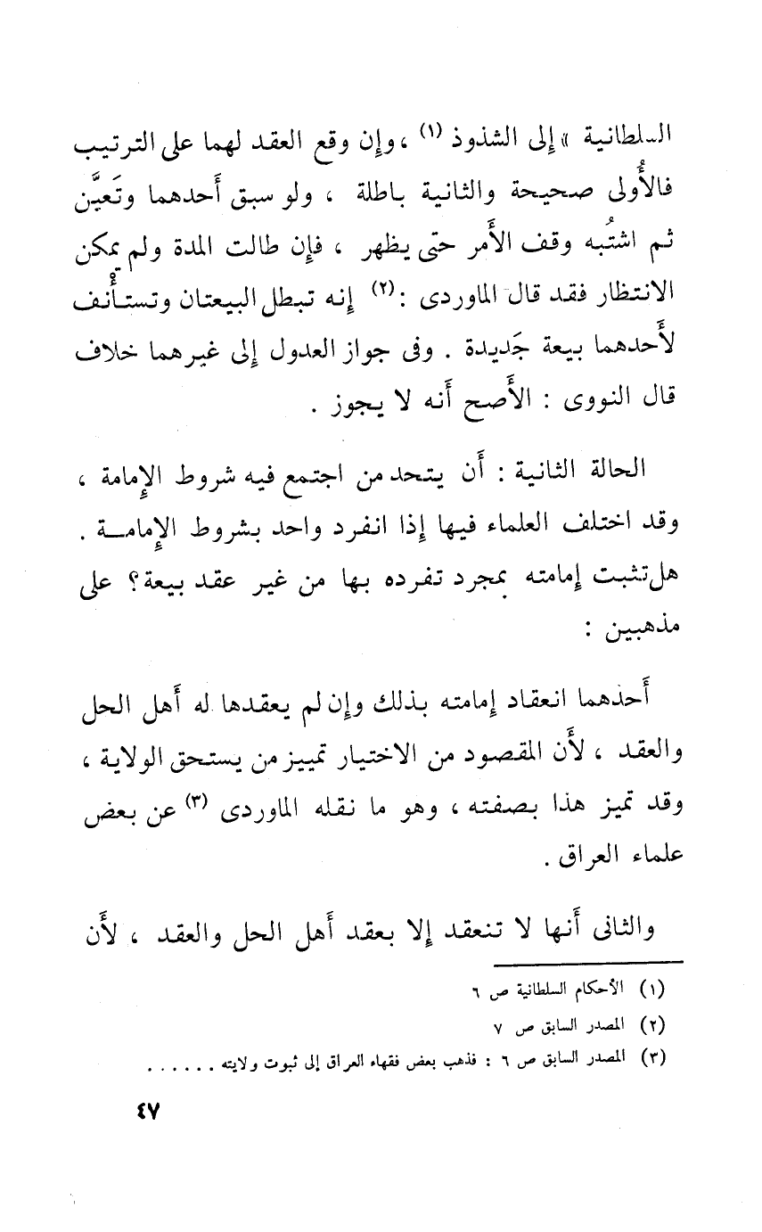 7 - السُّلْطَانِيَّة الى الشذوذ وان وَقع العقد لَهما على التَّرْتِيب فالاولى صَحِيحَة وَالثَّانيَِة بَاطِلَة وَلَو سبق احدهما وَتعين ثمَّ اشْتبهَ وقف الامر حَتَّى يظْهر فان طَالَتْ الْمدَّة وَلم يُمكن الِانْتِظَار فقد قَالَ الْمَاوَرْدِيّ انه تبطل البيعتان وتستأنف لاحدهما بيعَة جَدِيدَة وَفِي جَوَاز الْعُدُول الى غَيرهمَا خلاف قَالَ النوو الْأَصَح انه لَا يجوز