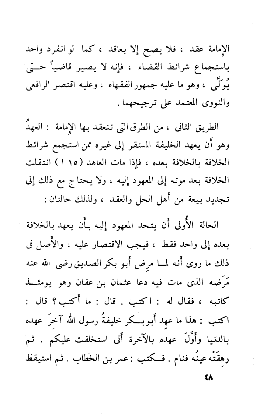 الطَّرِيق الثَّانِي من الطّرق الَّتِي تَنْعَقِد بهَا الامامة الْعَهْد وَهُوَ ان يعْهَد الْخَلِيفَة المستقر الى غَيره مِمَّن استجمع شَرَائِط الْخلَافَة بالخلافة بعده فاذا مَاتَ العاهد 15 أانتقلت الْخلَافَة بعد مَوته الى الْمَعْهُود اليه وَلَا يحْتَاج مَعَ ذَلِك الى تَجْدِيد بيهة من اهل الْحل وَالْعقد وَلذَلِك حالتان