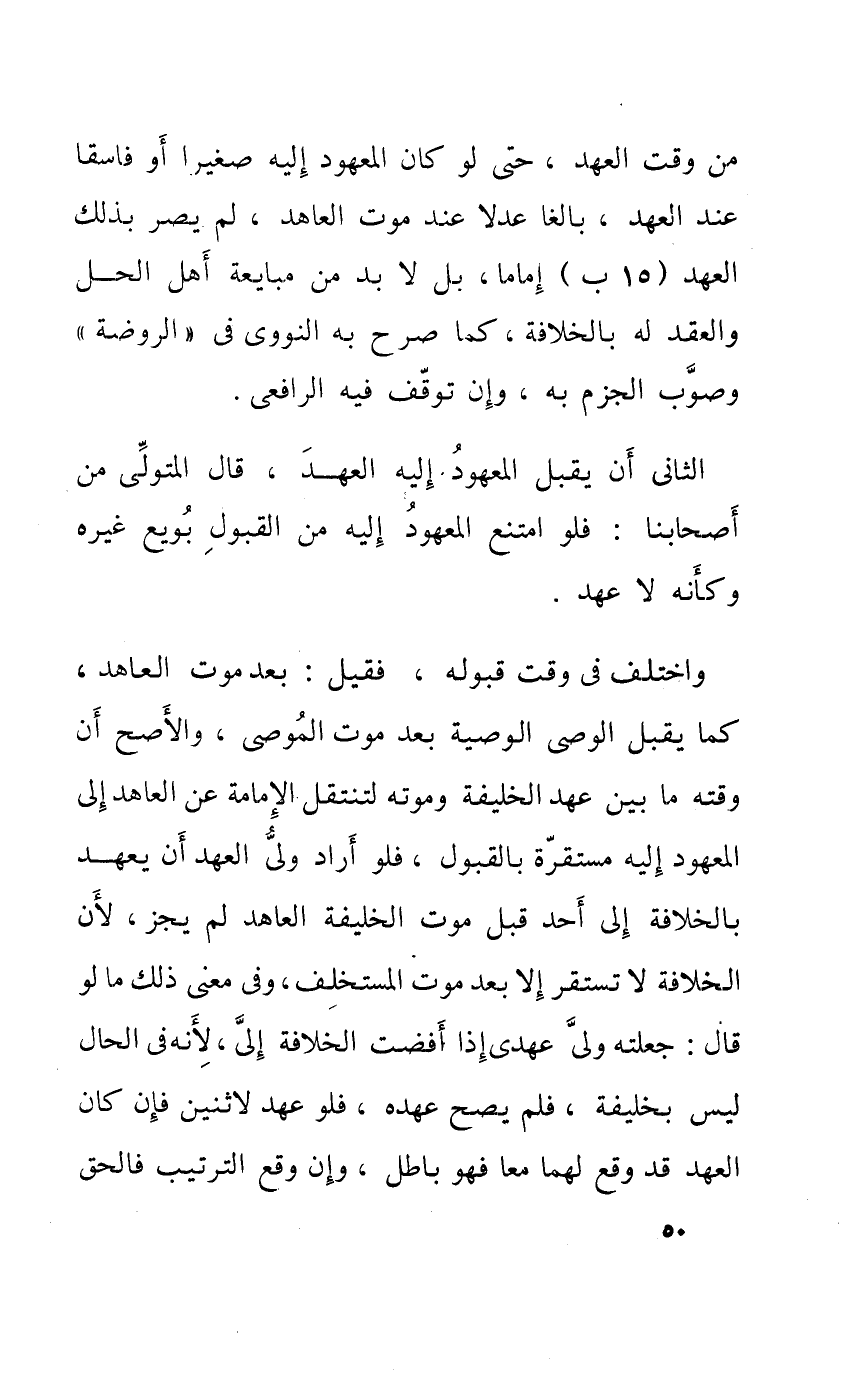 وَاخْتلف فِي وَقت قبُوله فَقيل بعد موت العاهد كَمَا يقبل الْوَصِيّ الْوَصِيَّة بعد موت الْمُوصي وَالأَصَح ان وقته مَا بَين عهد الْخَلِيفَة وَمَوته لتنتقل الامامة عَن العاهد الى الْمَعْهُود اليه مُسْتَقِرَّة بِالْقبُولِ فَلَو اراد ولي الْعَهْد ان يعْهَد بالخلافة الى اُحْدُ قبل موت الْخَلِيفَة العاهد لم يجز لَان الْخلَافَة لَا تَسْتَقِر الا بعد موت الْمُسْتَخْلف وَفِي معنى ذَلِك مَا لَو قَالَ جعلته ولي عهدي اذا افضت الْخلَافَة الي لانه فِي الْحَال لَيْسَ بخليفة فَلم يَصح عَهده فَلَو عهد لاثْنَيْنِ فان كَانَ الْعَهْد قد وَقع لَهما مَعًا فَهُوَ بَاطِل وان وَقع التَّرْتِيب فَالْحق