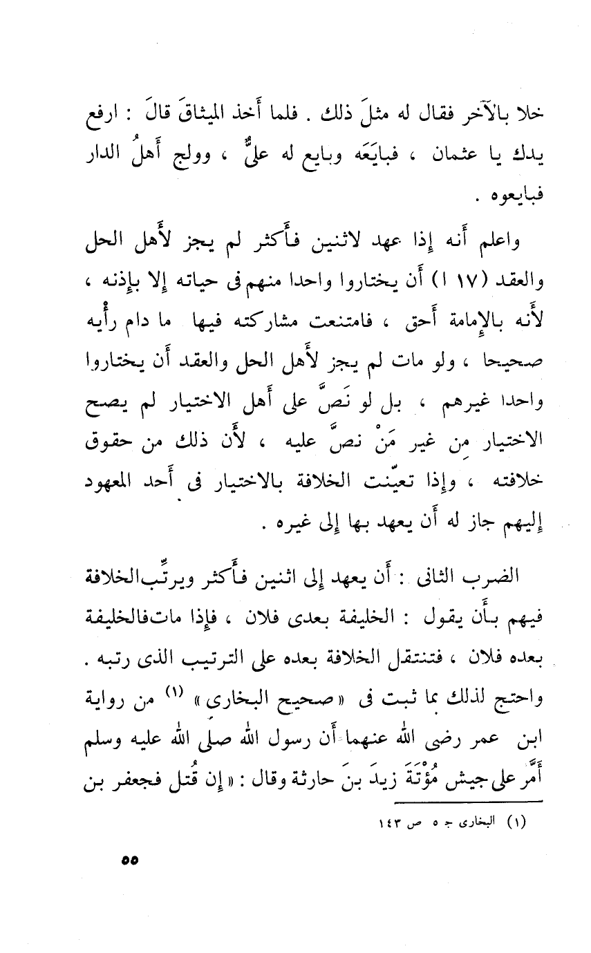 الضَّرْب الثَّانِي أَن يعْهَد إِلَى اثْنَيْنِ فَأكْثر ويرتب الْخلَافَة فيهم بِأَن يَقُول الْخَلِيفَة بعدى فلَان فَإِذا مَاتَ فالخليفة بعده فلَان فتنتقل الْخلَافَة بعده على التَّرْتِيب الذى رتبه احْتج لذَلِك بِمَا ثَبت فِي صَحِيح البخارى من رِوَايَة ابْن عمر رضى الله عَنْهُمَا أَن رَسُول الله صلى الله عَلَيْهِ وَسلم أَمر على جَيش مُؤْتَة زيد بن حَارِثَة وَقَالَ إِن قتل فجعفر بن