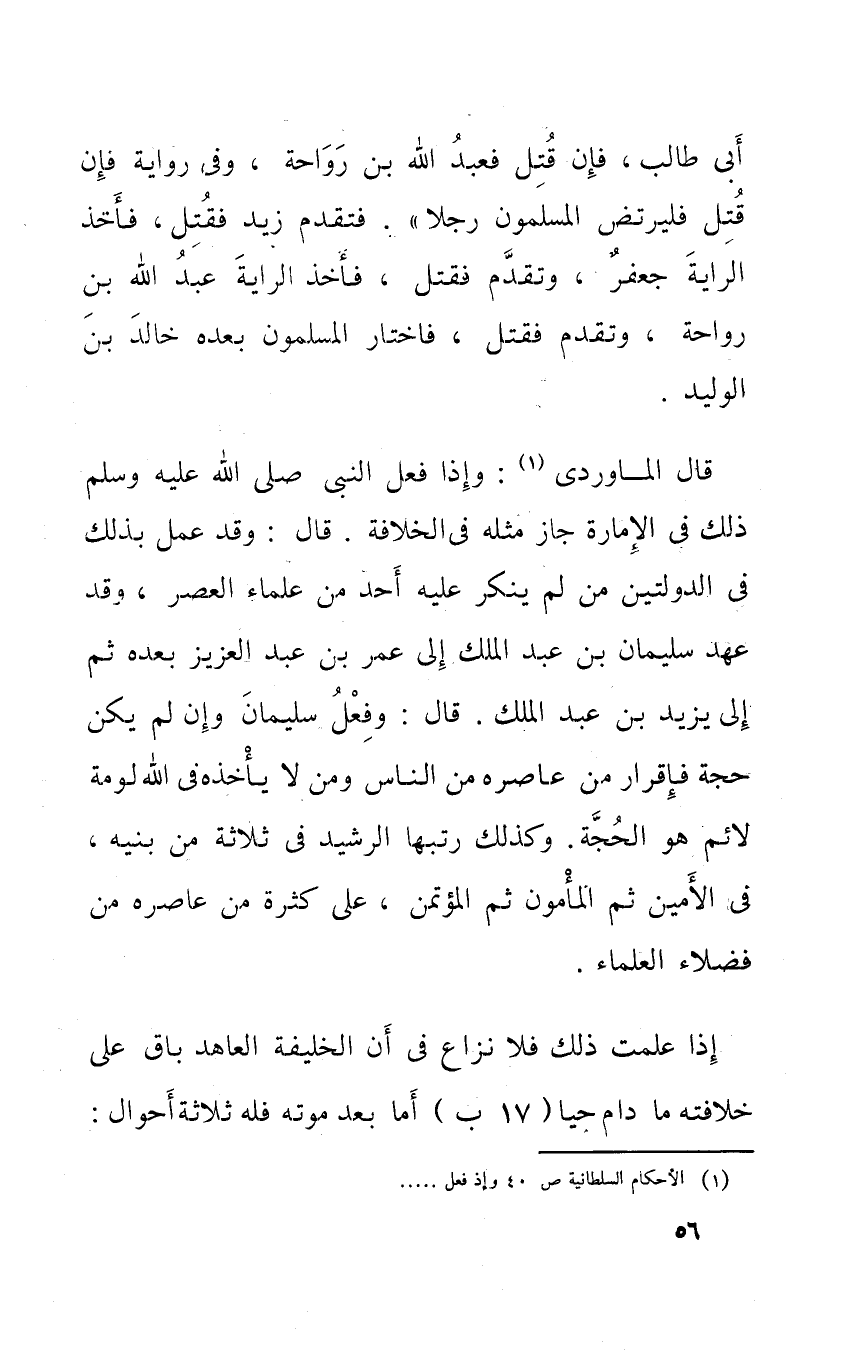 قَالَ الماوردى وَإِذا فعل النَّبِي صلى الله عَلَيْهِ وَسلم ذَلِك فِي الْإِمَارَة جَازَ مثله فِي الْخلَافَة قَالَ وَقد عمل بذلك فِي الدولتين من لم يُنكر عَلَيْهِ أحد من عُلَمَاء الْعَصْر وَقد عهد سُلَيْمَان بن عبد الْملك إِلَى عمر بن عبد الْعَزِيز بعده ثمَّ إِلَى يزِيد بن عبد الْملك قَالَ وَفعل سُلَيْمَان وَإِن لم يكن حجَّة فإقرار من عاصره من النَّاس وَمن لَا يَأْخُذهُ فِي الله لومة لائم هُوَ الْحجَّة وَكَذَلِكَ رتبها الرشيد فِي ثَلَاثَة من بنيه فِي الْأمين ثمَّ المامون ثمَّ المؤتمن على كَثْرَة من عاصره من فضلاء الْعلمَاء