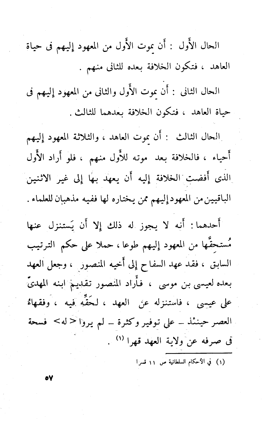 الْحَال الثَّالِث أَن يَمُوت العاهد وَالثَّلَاثَة الْمَعْهُود إِلَيْهِم أَحيَاء فالخلافة بعد مَوته للْأولِ مِنْهُم فَلَو أَرَادَ الأول الَّذِي أفضت الْخلَافَة إِلَيْهِ أَن يعْهَد بهَا إِلَى غير الأنثنين الباقيين من الْمَعْهُود إِلَيْهِم مِمَّن يختاره لَهَا فَفِيهِ مذهبان للْعُلَمَاء