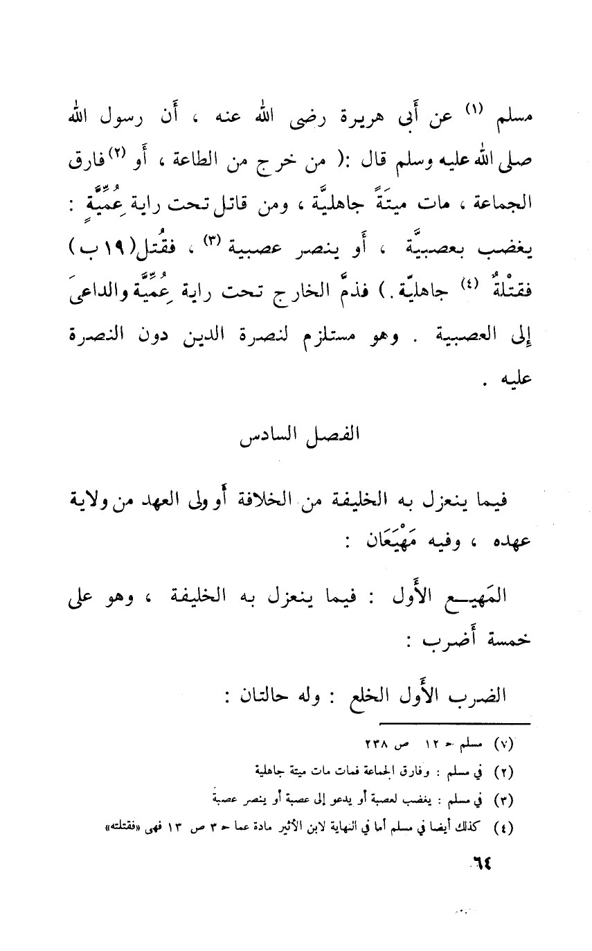 من خرج من الطَّاعَة أَو فَارق الْجَمَاعَة مَاتَ ميتَة جَاهِلِيَّة وَمن قَاتل تَحت راية عمية يغْضب بعصبية أَو ينصر عصبية فَقتل (19 ب) فقتلة جَاهِلِيَّة