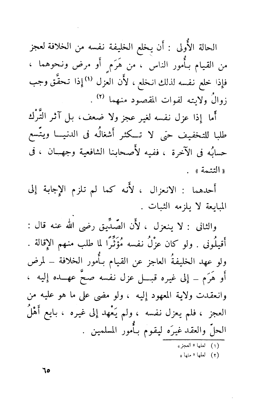 الْحَالة الأولى أَن يخلع الْخَلِيفَة نَفسه من الْخلَافَة لعجز من الْقيام بِأُمُور النَّاس من هرم أَو مرض وَنَحْوهمَا فَإِذا خلع نَفسه لذَلِك انخلع لِأَن الْعَزْل إِذا تحقق وَجب زَوَاله ولَايَته لفَوَات الْمَقْصُود مِنْهُمَا