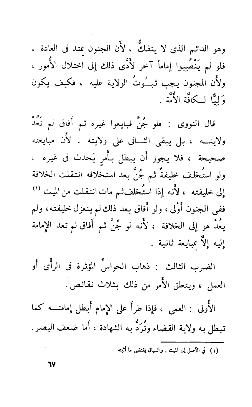قَالَ النَّوَوِيّ فَلَو جن فَبَايعُوا غَيره ثمَّ أَفَاق لم تعد ولَايَته بل يبْقى الثَّانِي على ولَايَته لِأَن مبايعته صَحِيحَة فَلَا يجوز أَن يبطل بِأَمْر يحدث فِي غَيره وَلَو اسْتخْلف خَليفَة ثمَّ جن بعد استخلافه انْتَقَلت الْخلَافَة إِلَى خَلِيفَته لِأَنَّهُ إِذا اسْتخْلف ثمَّ مَاتَ انْتَقَلت من الْمَيِّت فَفِي الْجُنُون أولى وَلَو أَفَاق بعد ذَلِك لم يَنْعَزِل خَليفَة وَلم يعد هُوَ إِلَى الْخلَافَة لِأَنَّهُ لَو جن ثمَّ أَفَاق لم تعد الْإِمَامَة إِلَيْهِ إِلَّا بمبايعة ثَانِيَة