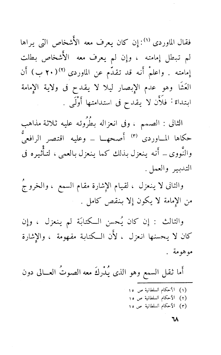 فَقَالَ الْمَاوَرْدِيّ إِن كَانَ يعرف مَعَه الْأَشْخَاص الَّتِي يَرَاهَا لم تبطل إِمَامَته وَإِن لم يعرف مَعَه الْأَشْخَاص بطلت إِمَامَته وَاعْلَم أَنه قد تقدم عَن الْمَاوَرْدِيّ (20 ب) أَن العشا وَهُوَ عدم الإبصار لَيْلًا لَا يقْدَح فِي ولَايَة الْإِمَارَة ابْتِدَاء فَلِأَن لَا يقْدَح فِي استدامتها أولى