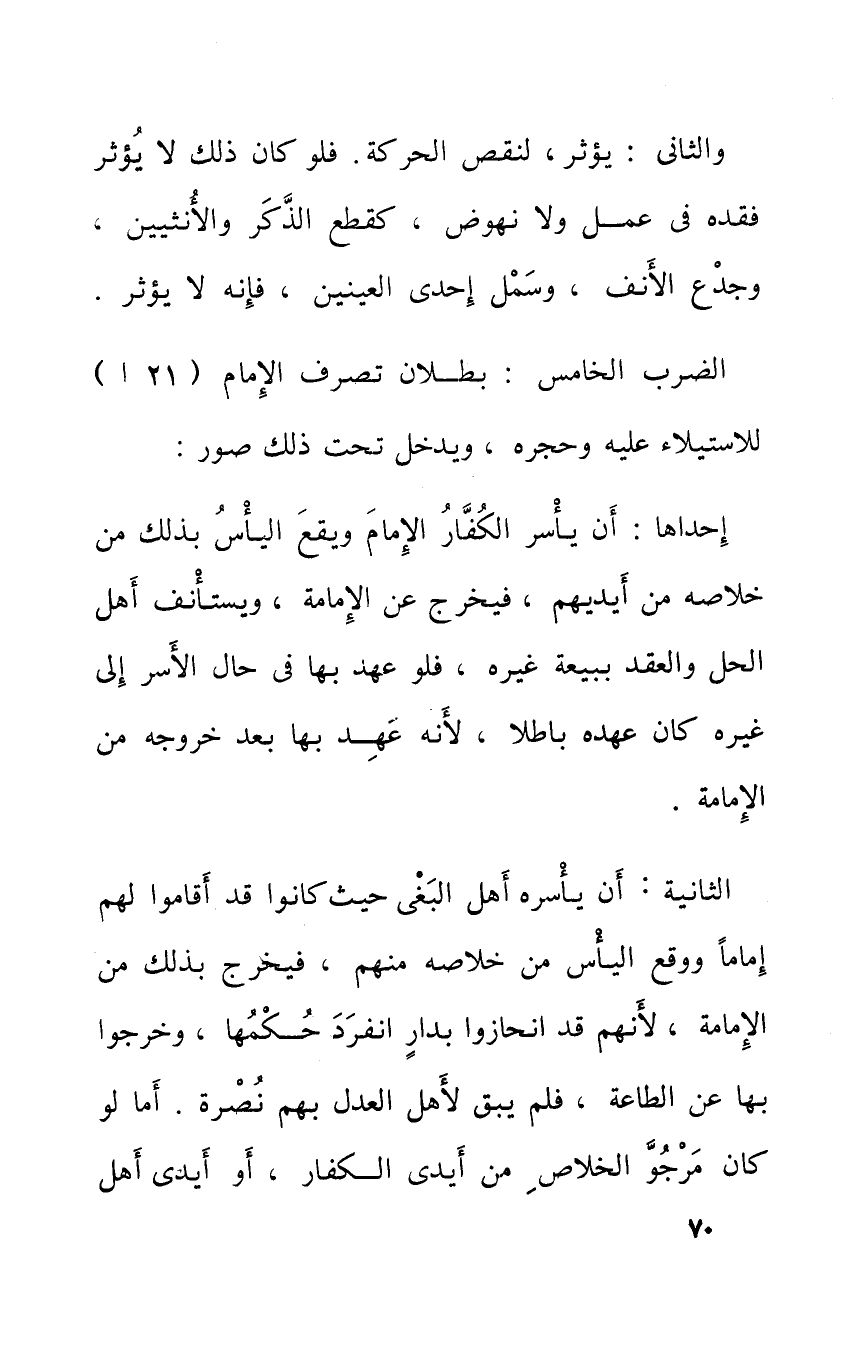 الضَّرْب الْخَامِس بطلَان تصرف الإِمَام للاستيلاء عَلَيْهِ وحجره وَيدخل تَحت ذَلِك صور إِحْدَاهَا أَن يأسر الْكفَّار الإِمَام وَيَقَع الْيَأْس بذلك من خلاصه من أَيْديهم فَيخرج عَن الْإِمَامَة ويستأنف أهل الْحل وَالْعقد ببيعة غَيره فَلَو عهد بهَا فِي الْحَال الْأسر إِلَى غَيره كَانَ عَهده بَاطِلا لِأَنَّهُ عهد بهَا بعد خُرُوجه من الْإِمَامَة