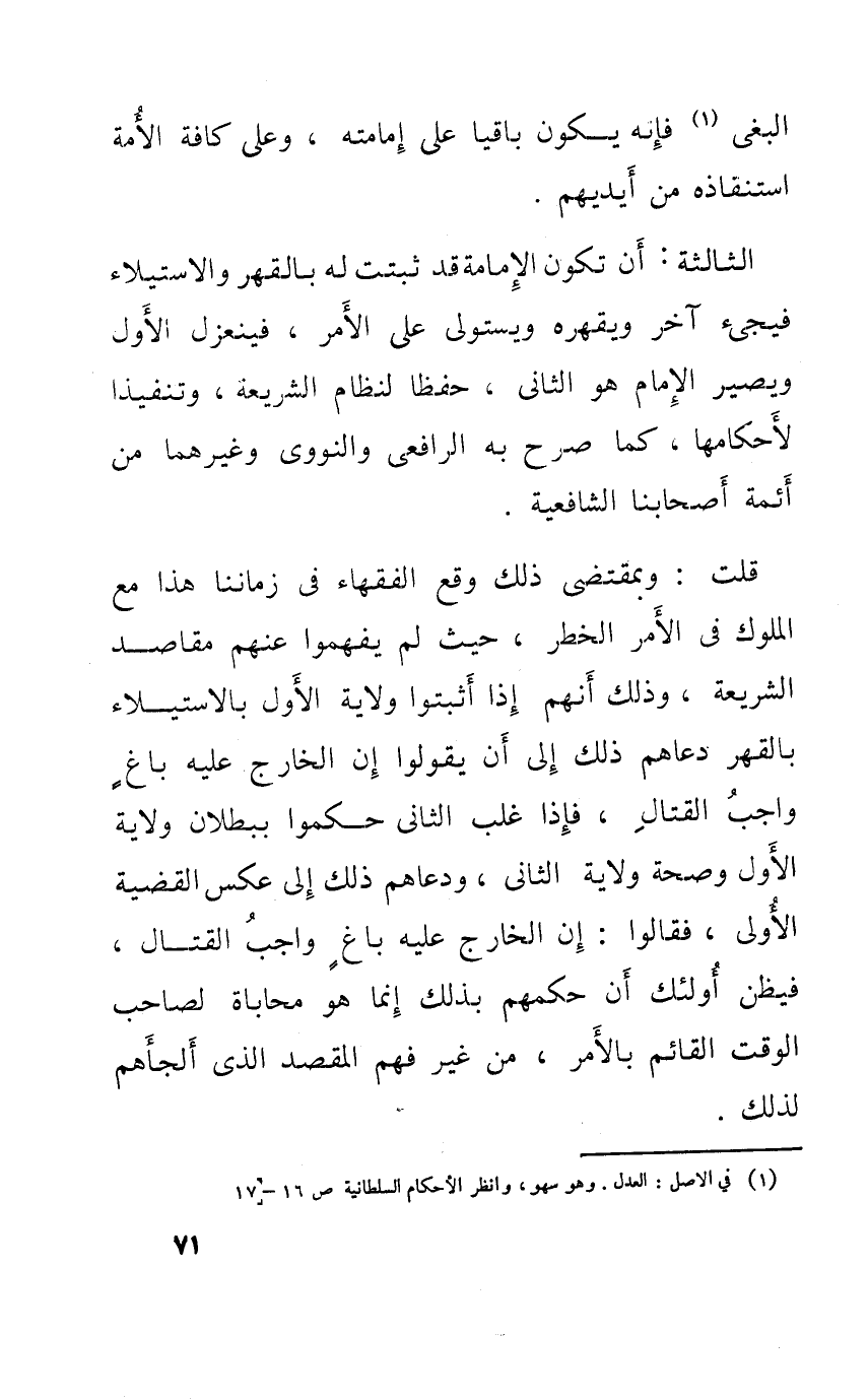 الْبَغي فَإِنَّهُ يكون بَاقِيا على إِمَامَته وعَلى كَافَّة الْأمة استنقاذه من أَيْديهم الثَّالِثَة أَن تكون الْإِمَامَة قد ثبتَتْ لَهُ بالقهر والإستيلاء فيجئ آخر ويقهره وستولى على الْأَمر فينعزل الأول وَيصير الإِمَام هُوَ الثَّانِي حفظا لنظام الشَّرِيعَة وتنفيذا لأحكامها كَمَا صرح بِهِ الرَّافِعِيّ وَالنَّوَوِيّ وَغَيرهمَا من أَئِمَّة اصحابنا الشَّافِعِيَّة