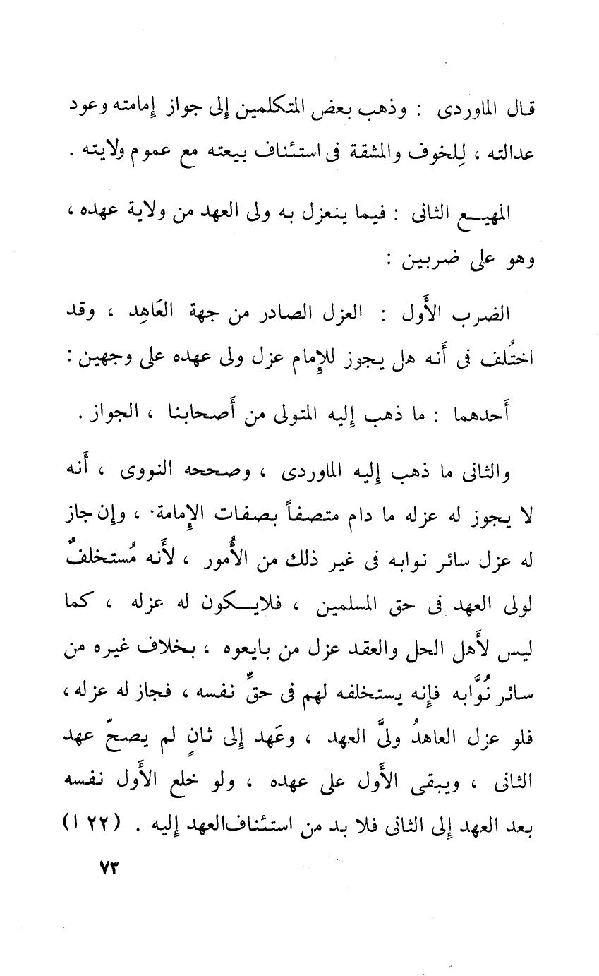 وَالثَّانِي مَا ذهب إِلَيْهِ الْمَاوَرْدِيّ وَصَححهُ النَّوَوِيّ أَنه لَا يجوز لَهُ عَزله مَا دَامَ متصفا بِصِفَات الْإِمَامَة وَإِن جَازَ لَهُ عزل سَائِر نوابه فِي غير ذَلِك من الْأُمُور لِأَنَّهُ مستخلف لولى الْعَهْد فِي حق الْمُسلمين فَلَا يكون لَهُ عَزله كَمَا لَيْسَ لأهل الْحل وَالْعقد وعزل من بَايعُوهُ بِخِلَاف غَيره من سَائِر نوابه فَإِنَّهُ يستخلفه لَهُم فِي حق نَفسه فَجَاز لَهُ عَزله فَلَو عزل العاهد ولي الْعَهْد وعهد الى ثَان لم يَصح عهد الثَّانِي وَيبقى الأول على عَهده وَلَو خلع الأل نَفسه بعد الْعَهْد إِلَى الثَّانِي فَلَا بُد من اسْتِئْنَاف الْعَهْد إِلَيْهِ (122)