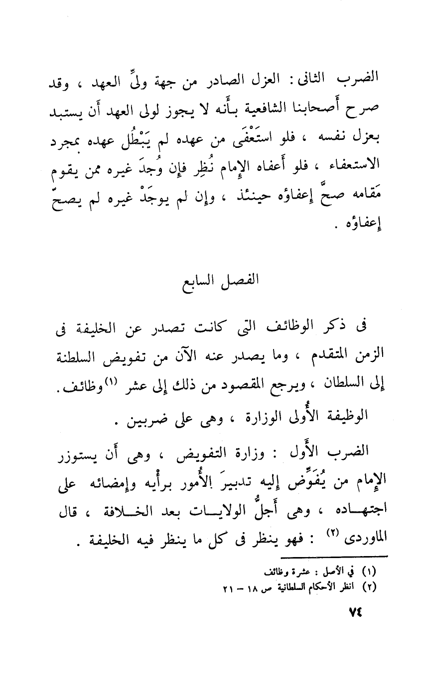 الضَّرْب الأول وزارة التَّفْوِيض وَهِي أَن يستوزر الإِمَام من يُفَوض إِلَيْهِ تَدْبِير الْأُمُور بِرَأْيهِ وإمضائه على اجْتِهَاده وَهِي أجل الولايات بعد الْخلَافَة قَالَ الْمَاوَرْدِيّ فَهُوَ ينظر فِي كل ماينظر فِيهِ الْخَلِيفَة