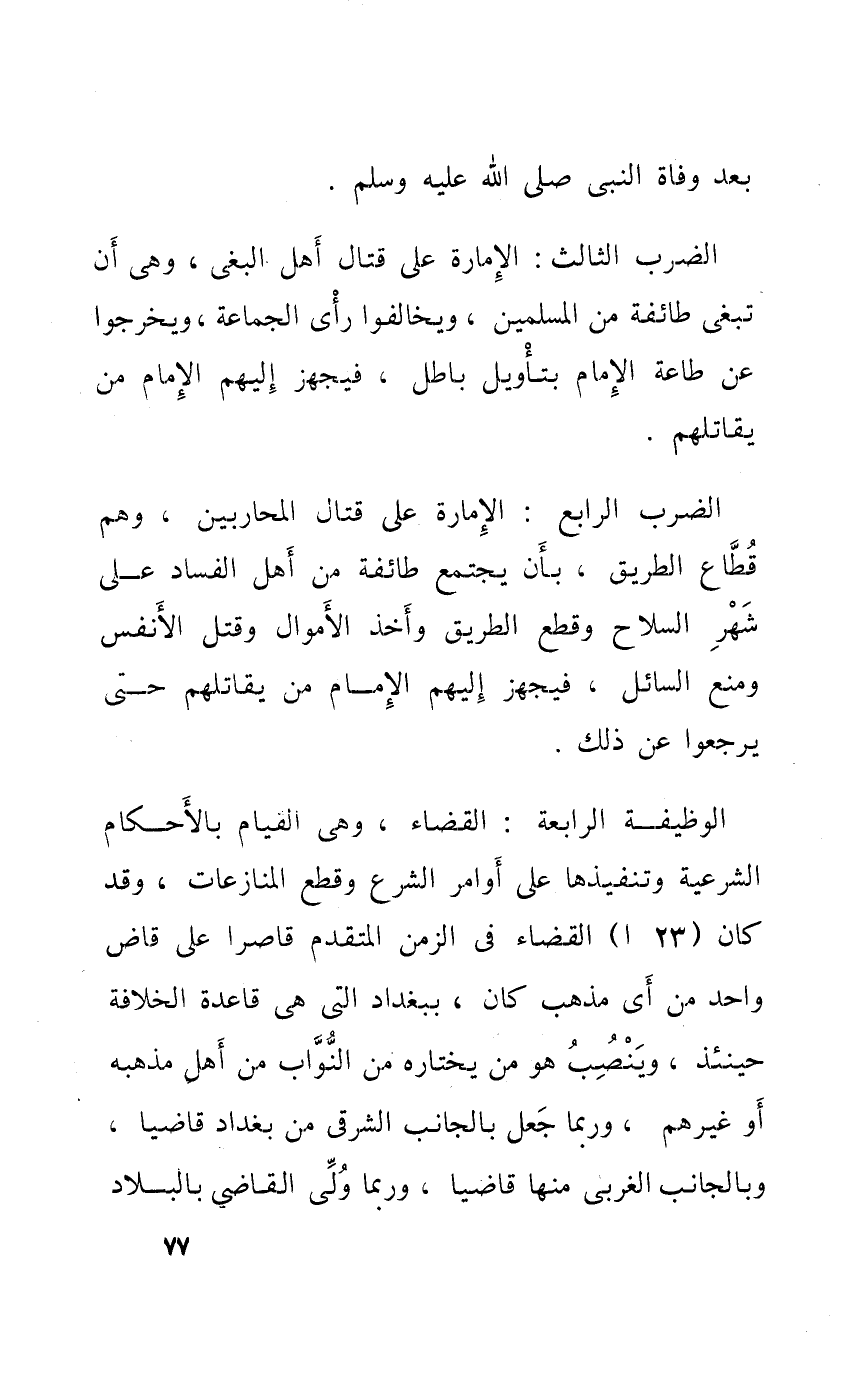 الضَّرْب الثَّالِث الْإِمَارَة على قتال أهل الْبَغي وَهِي أَن تبغى طَائِفَة من الْمُسلمين ويخالفوا رأى الْجَمَاعَة ويخرجوا عَن طَاعَة الإِمَام بِتَأْوِيل بَاطِل فيجهز إِلَيْهِم الإِمَام من يقاتلهم