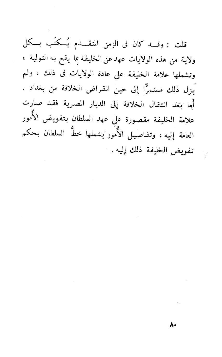 قلت وَقد كَانَ فِي الزَّمن الْمُتَقَدّم يكْتب بِكُل ولَايَة من هَذِه الولايات عهد عَن الْخَلِيفَة بِمَا يَقع بِهِ لتولية وتشملها عَلامَة الْخَلِيفَة على عَادَة الولايات فِي ذَلِك وَلم يزل ذَلِك مستمرا إِلَى حِين انْقِرَاض الْخلَافَة من بَغْدَاد أما بعد انْتِقَال الْخلَافَة إِلَى الديار المصرية فقد صَارَت عَلامَة الْخَلِيفَة مَقْصُورَة على عهد السُّلْطَان بتفويض الْأُمُور الْعَامَّة إِلَيْهِ وتفاصيل الْأُمُور يشملها خطّ السُّلْطَان بِحكم تَفْوِيض الْخَلِيفَة ذَلِك إِلَيْهِ