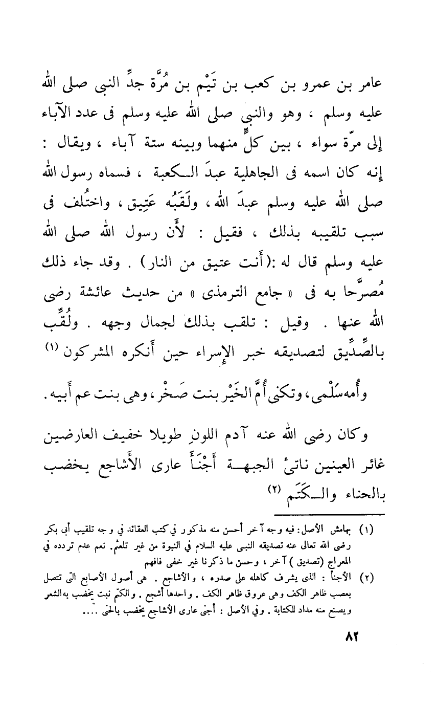 عَامر نب عَمْرو بن كَعْب بن تيم بن مرّة جد النَّبِي صلى الله عَلَيْهِ وَسلم وَهُوَ النَّبِي صلى الله عَلَيْهِ وَسلم فِي عدد الْآبَاء إِلَى مرّة سَوَاء بَين كل مِنْهُمَا وَبَينه سِتَّة آبَاء وَيُقَال إِنَّه كَانَ إسمه فِي الْجَاهِلِيَّة عبد الْكَعْبَة فَسَماهُ رَسُول الله صلى الله عَلَيْهِ وَسلم عبد الله ولقبه عَتيق واخنلف فِي سَبَب تلقيبه بذلك فَقيل لِأَن رَسُول الله صلى الله عَلَيْهِ وَسلم قَالَ لَهُ أَنْت عَتيق من النَّار وَقد جَاءَ ذَلِك مُصَرحًا بِهِ فِي جَامع التِّرْمِذِيّ من حَدِيث عَائِشَة رَضِي الله عَنْهَا وَقيل تلقب بذلك لجمال وَجهه ولقب بِالصديقِ لتصديقه خبر الأسراء حِين انكره الْمُشْركُونَ