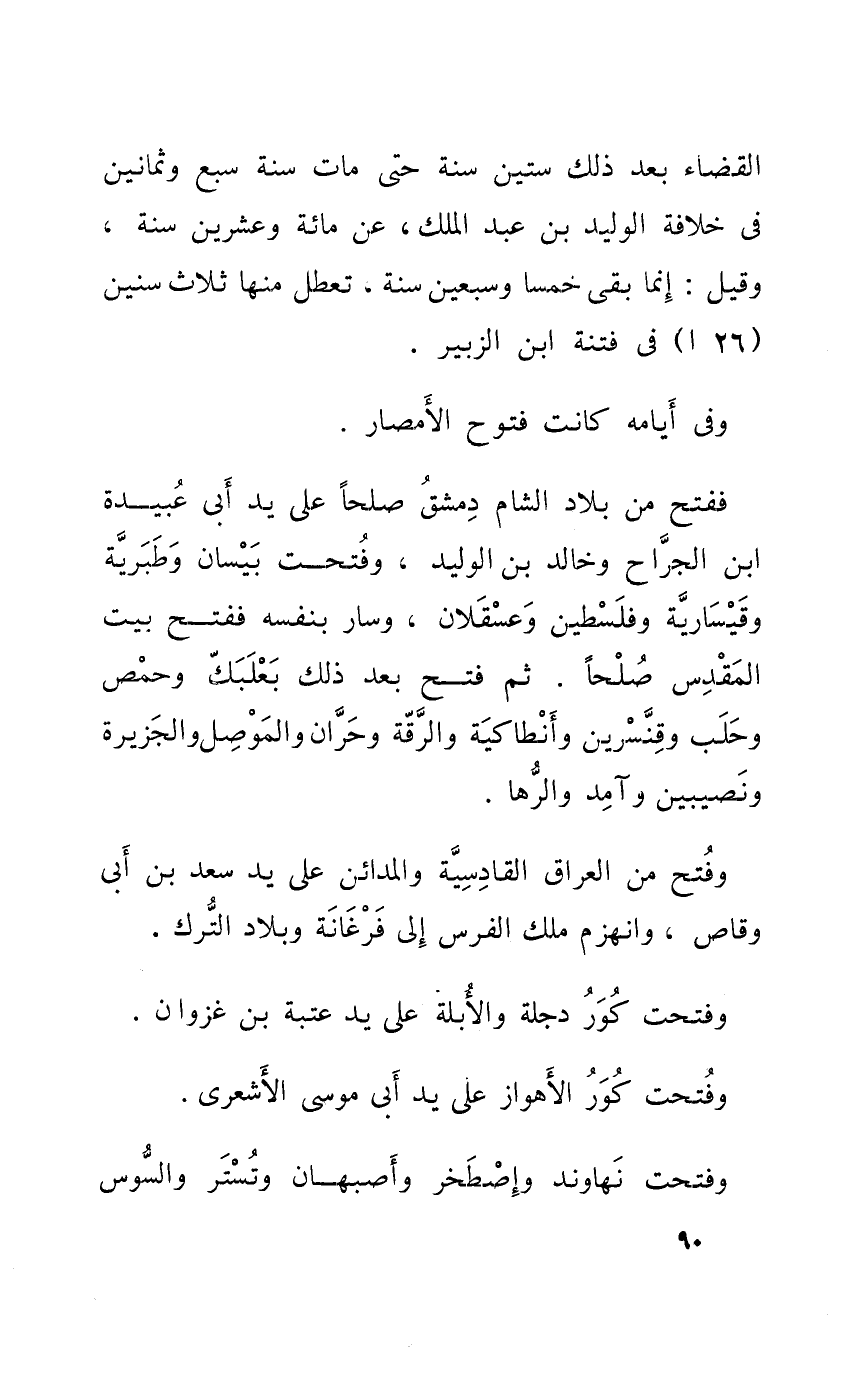 فَفتح من بِلَاد الشَّام دمشق صلحا على يَد أبي عُبَيْدَة ابْن الْجراح وخَالِد بن الْوَلِيد وَفتحت بيسان وطبرية وقيسارية وفلسطين وعسقلان وَسَار بِنَفسِهِ فَفتح بَيت الْمُقَدّس صلحا ثمَّ فتح بعد لَك بعلبك وحمص وحلب وقنسرين وأنطاكية والرقة وحران والموصل والجزيرة وتصيبين وآمد والرها