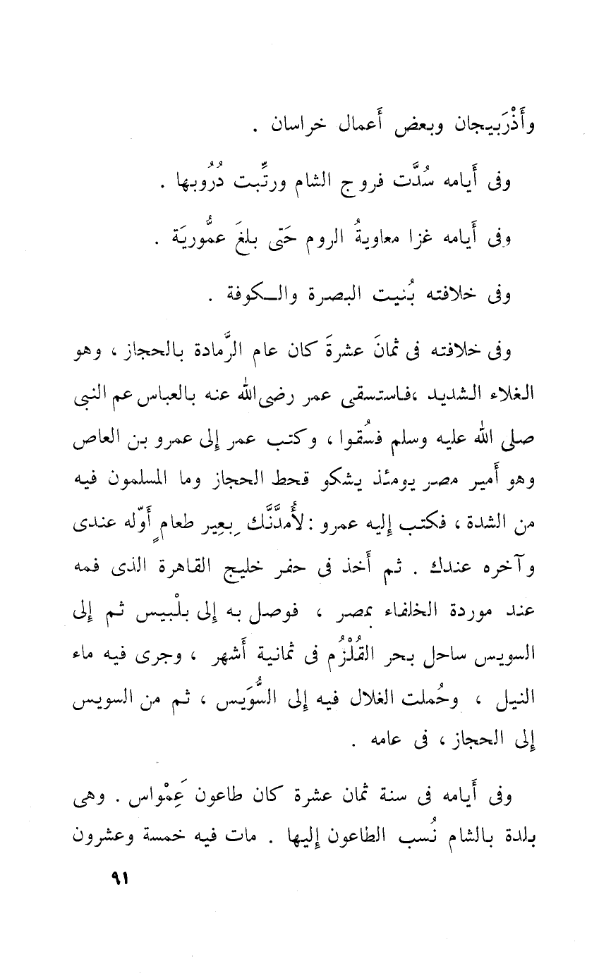 فِي خِلَافَته فِي ثَمَان عشرَة كَانَ عَام الرَّمَادَة بالحجاز وَهُوَ الغلاء الشَّديد فَاسْتَسْقَى عمر رَضِي الله عَنهُ بِالْعَبَّاسِ عَم النَّبِي صلى الله عَلَيْهِ سلم فسقوا وَكتب عمر إِلَى عَمْرو بن الْعَاصِ وَهُوَ أَمِير مصر يمئذ يشك قحط الْحجاز مَا الْمُسلمُونَ فِيهِ من الشدَّة فَكتب إِلَيْهِ عمر لأمدنك بعير طَعَام أَوله عِنْدِي آخِره عنْدك ثمَّ أَخذ فِي حفر خليج الْقَاهِرَة الَّذِي فَمه عِنْد موردة الْخُلَفَاء بِمصْر فوصل بِهِ إِلَى بلبيس ثمَّ إِلَى السويس سَاحل بَحر القلزم فِي ثَمَانِيَة أشهر وَجرى فِيهِ مَاء النّيل حملت الغلال فِيهِ إِلَى السويس ثمَّ من السويس إِلَى الْحجاز فِي عَامَّة