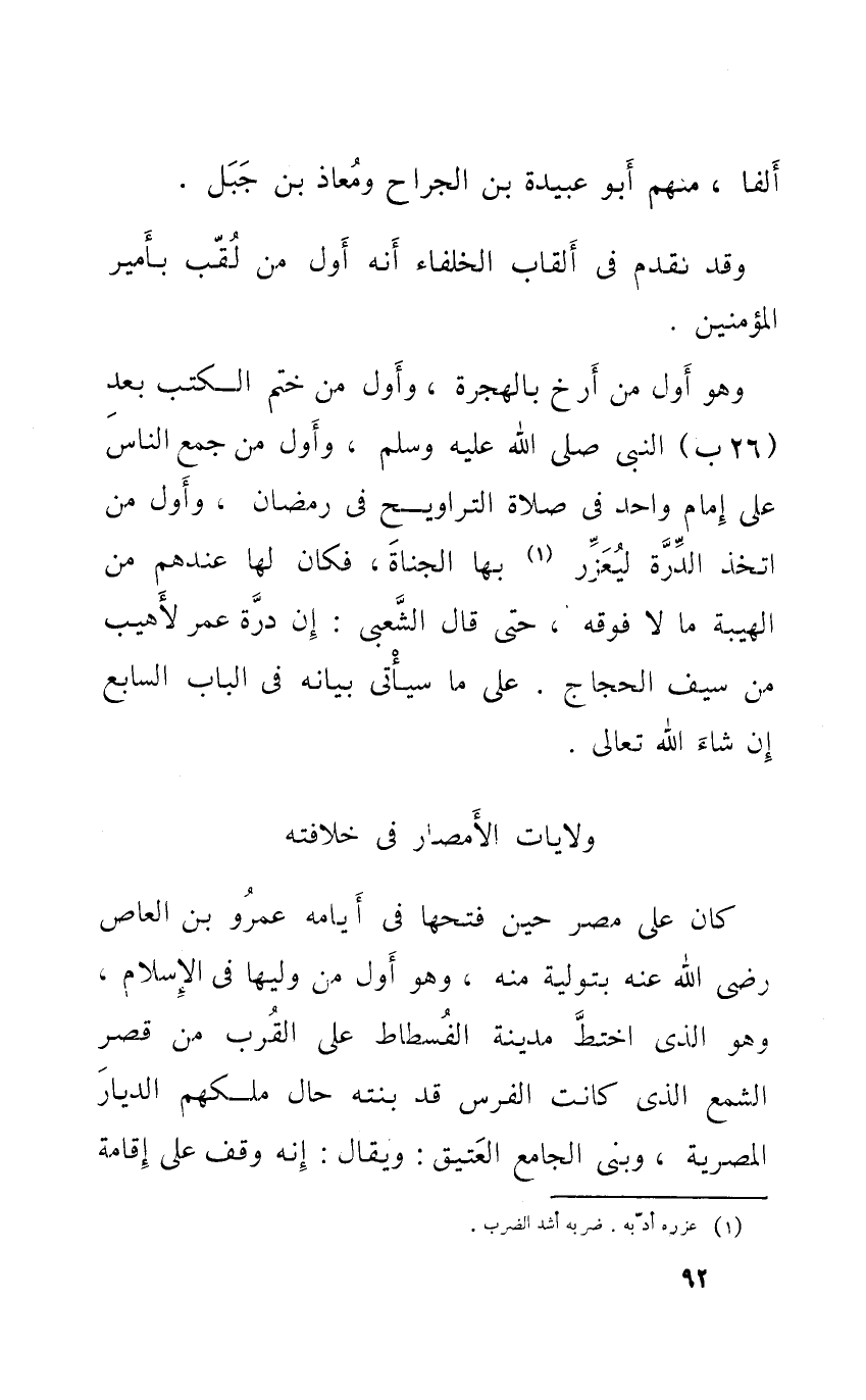 وَهُوَ أول من أرخ بِالْهِجْرَةِ وَأول من ختم الْكتب بعد (26 ب) النَّبِي صلى الله عَلَيْهِ وَسلم وَأول من جمع النَّاس على إِمَام وَاحِد فِي صَلَاة التَّرَاوِيح فِي رَمَضَان وَأول من اتخذ الدرة ليعزر بهَا الجناة فَكَانَ لَهَا عِنْدهم من الهيبة مَا لَا فَوْقه حَتَّى قَالَ الشّعبِيّ إِن درة عمر لأهيب من سيف الْحجَّاج على مَا سَيَأْتِي بَيَانه فِي الْبَاب السَّابِع إِن شَاءَ الله تَعَالَى