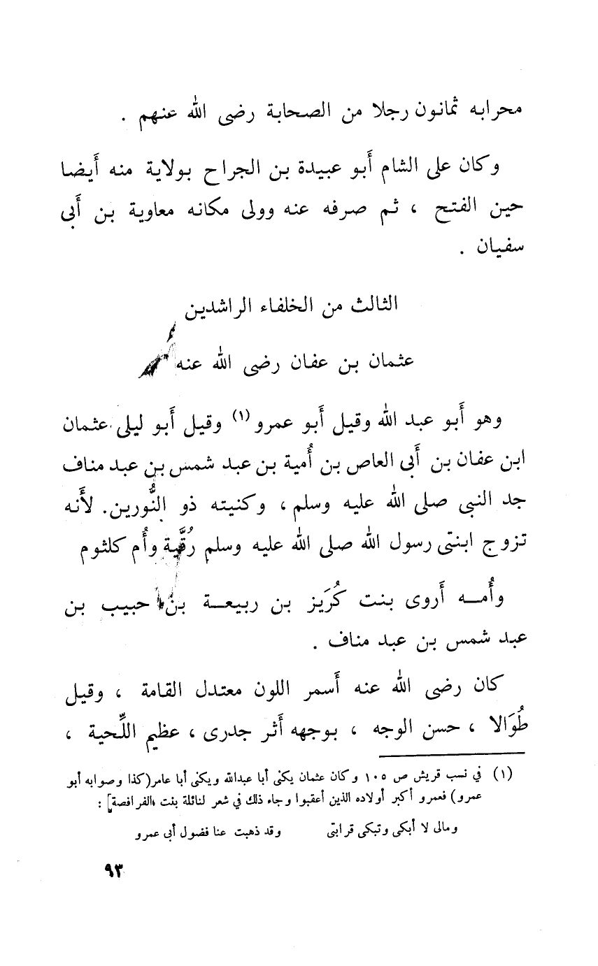 وَهُوَ أَبُو عبد الله وَقيل أَبُو عمر وَقيل أَب ليلى عُثْمَان ابْن عَفَّان بن أبي الْعَاصِ بن أُميَّة بن عبد شمس بن عبد منَاف جد النَّبِي صلى الله عَلَيْهِ وَسلم وكنيته ذُو النورين لِأَنَّهُ تزوج ابنتى رَسُول الله صلى الله عَلَيْهِ وَسلم رقية وَأم كُلْثُوم
