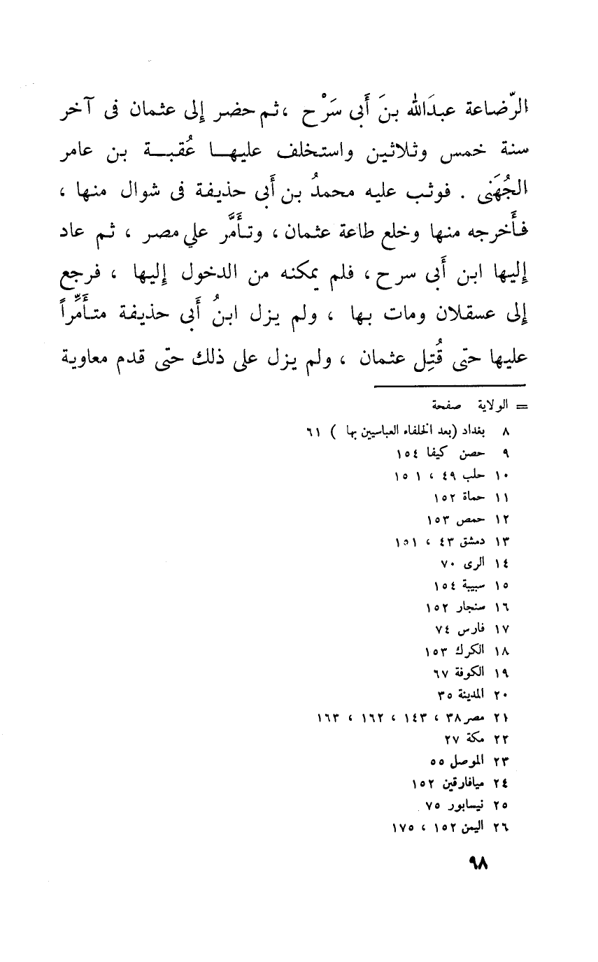الرضَاعَة عبد الله بن أبي سرح ثمَّ حضر إِلَى عُثْمَان فِي آخر سنة خمس وَثَلَاثِينَ واستخلف عَلَيْهَا عقبَة بن عَامر الْجُهَنِيّ فَوَثَبَ عَلَيْهِ مُحَمَّد بن أبي حُذَيْفَة فِي شَوَّال مِنْهَا فَأخْرجهُ مِنْهَا وخلع طَاعَة عُثْمَان تَأمر على مصر ثمَّ عَاد إِلَيْهَا ابْن أبي سرح فَلم يُمكنهُ من الدُّخُول إِلَيْهَا فَرجع إِلَى عسقلان وَمَات بهَا وَلم يزل ابْن أبي حُذَيْفَة متأمرا عَلَيْهَا حَتَّى قتل عُثْمَان وَلم يزل على ذَلِك حَتَّى قدم مُعَاوِيَة