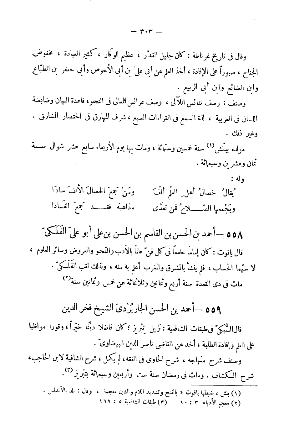 قَالَ ياقوت: كَانَ إِمَامًا جَامعا فِي كل فن عَالما بالأدب والنحو وَالْعرُوض وَسَائِر الْعُلُوم، لَا سِيمَا الْحساب، فَلم ينشأ بالمشرق وَالْمغْرب أعلم بِهِ مِنْهُ، وَلذَلِك لقب الفلكي.