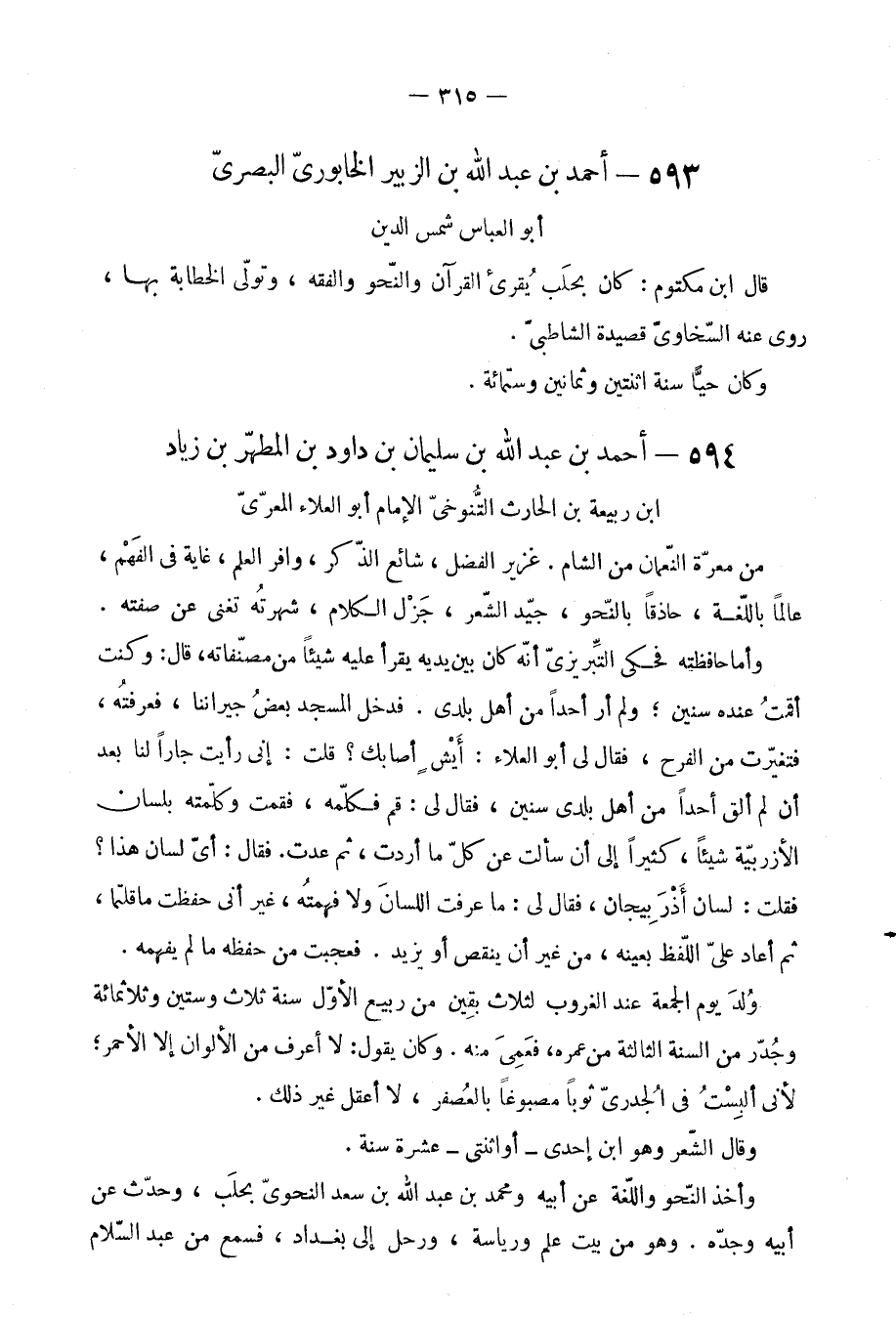594 - أَحْمد بن عبد الله بن سُلَيْمَان بن دَاوُد بن المطهر بن زِيَاد ابْن ربيعَة بن الْحَارِث التنوخي الإِمَام أَبُو الْعَلَاء المعري