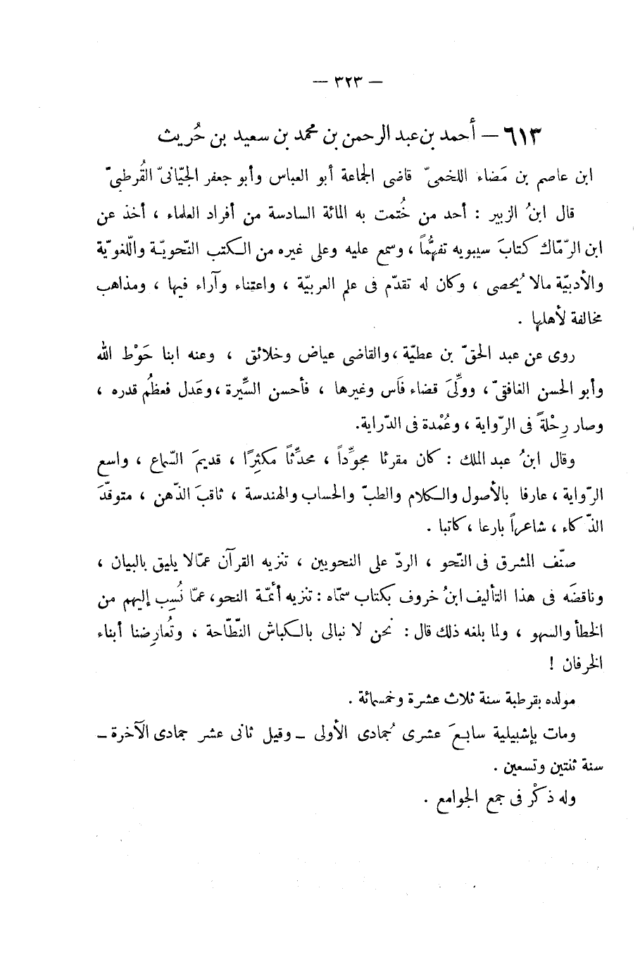 613 - أَحْمد بن عبد الرَّحْمَن بن مُحَمَّد بن سعيد بن حُرَيْث ابْن عَاصِم بن مضاء اللَّخْمِيّ قَاضِي الْجَمَاعَة أَبُو الْعَبَّاس وَأَبُو جَعْفَر الجياني الْقُرْطُبِيّ