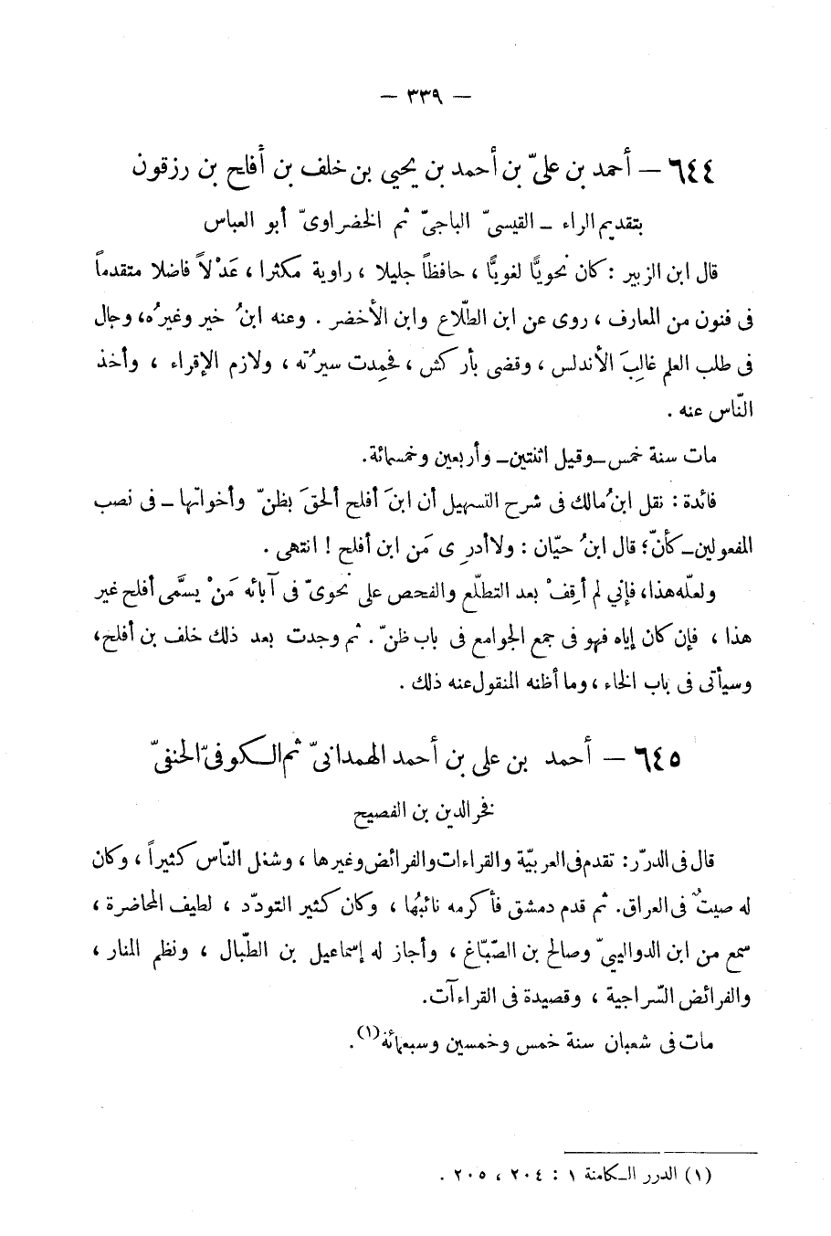 وَلَعَلَّه هَذَا، فَإِنِّي لم أَقف بعد التطلع والفحص على نحوي فِي آبَائِهِ من يُسمى أَفْلح غير هَذَا، فَإِن كَانَ إِيَّاه فَهُوَ فِي جمع الْجَوَامِع فِي بَاب ظن. ثمَّ وجدت بعد ذَلِك خلف بن أَفْلح، وَسَيَأْتِي فِي بَاب الْخَاء، وَمَا أَظُنهُ الْمَنْقُول عَنهُ ذَلِك.
