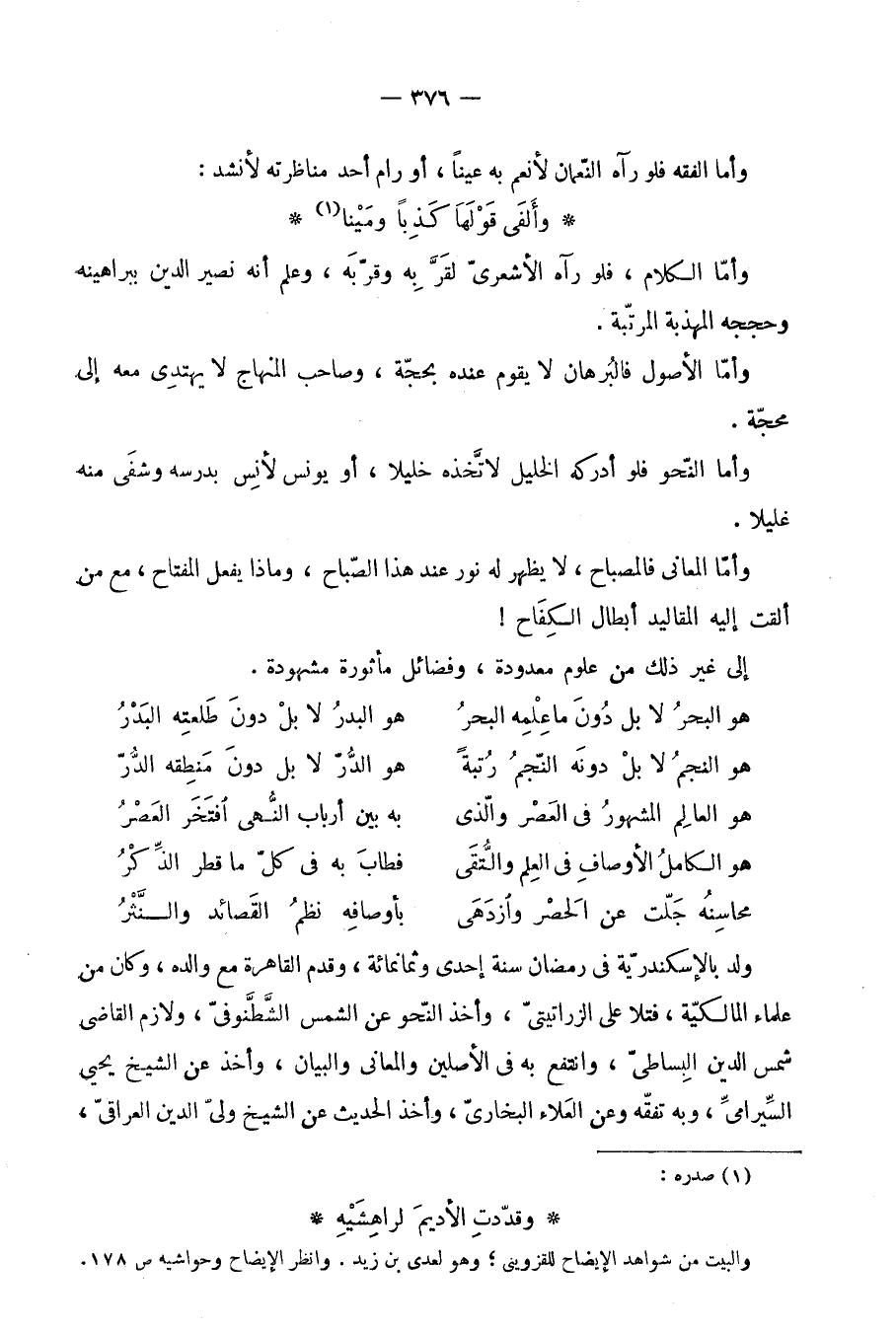 (هُوَ الْعَالم الْمَشْهُور فِي الْعَصْر وَالَّذِي ... بِهِ بَين أَرْبَاب النهى افتخر الْعَصْر)