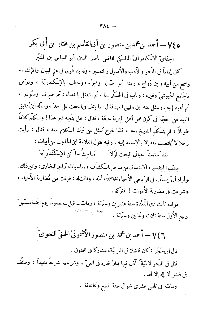 745 - أَحْمد بن مُحَمَّد بن مَنْصُور بن أبي الْقَاسِم بن مُخْتَار بن أبي بكر الجذامي الإسْكَنْدراني الْمَالِكِي القَاضِي نَاصِر الدّين أَبُو الْعَبَّاس بن الْمُنِير