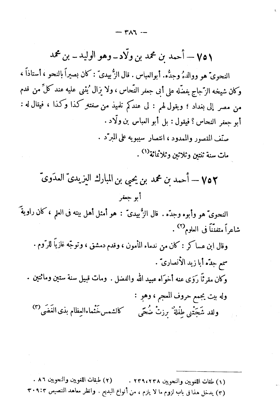 752 - أَحْمد بن مُحَمَّد بن يحيى بن الْمُبَارك اليزيدي الْعَدوي أَبُو جَعْفَر النَّحْوِيّ هُوَ وَأَبوهُ وجده. قَالَ الزبيدِيّ: هُوَ أمثل أهل بَيته فِي الْعلم، كَانَ راوية شَاعِرًا متفننا فِي الْعُلُوم.