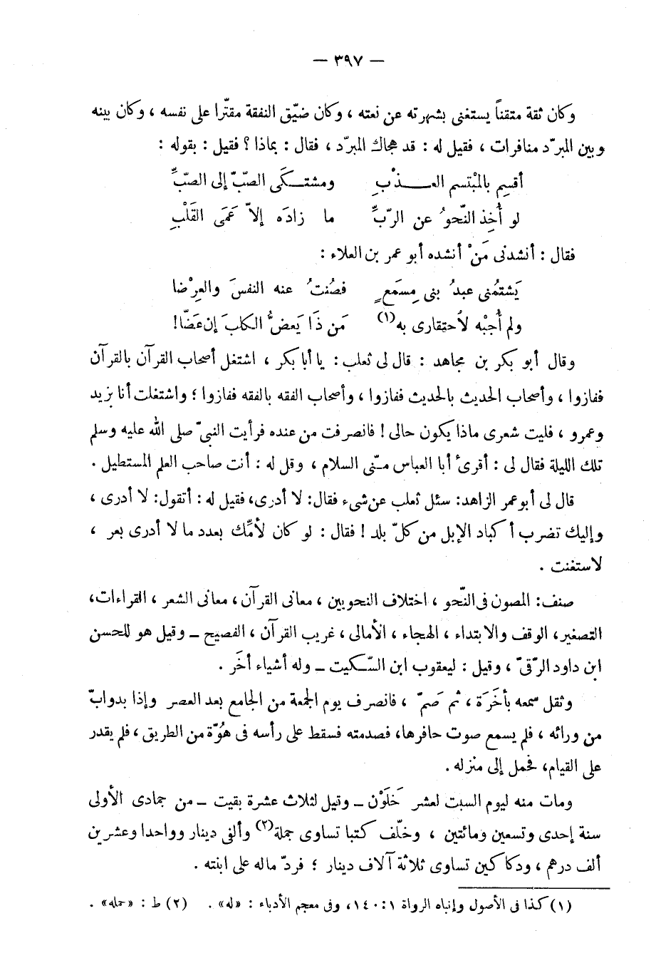 وَكَانَ ثِقَة متقنا يَسْتَغْنِي بشهرته عَن نعْمَته، وَكَانَ ضيق النَّفَقَة مقترا على نَفسه، وَكَانَ بَينه وَبَين الْمبرد منافرات، فَقيل لَهُ: قد هجاك الْمبرد، فَقَالَ: بِمَاذَا؟ فَقيل: بقوله: