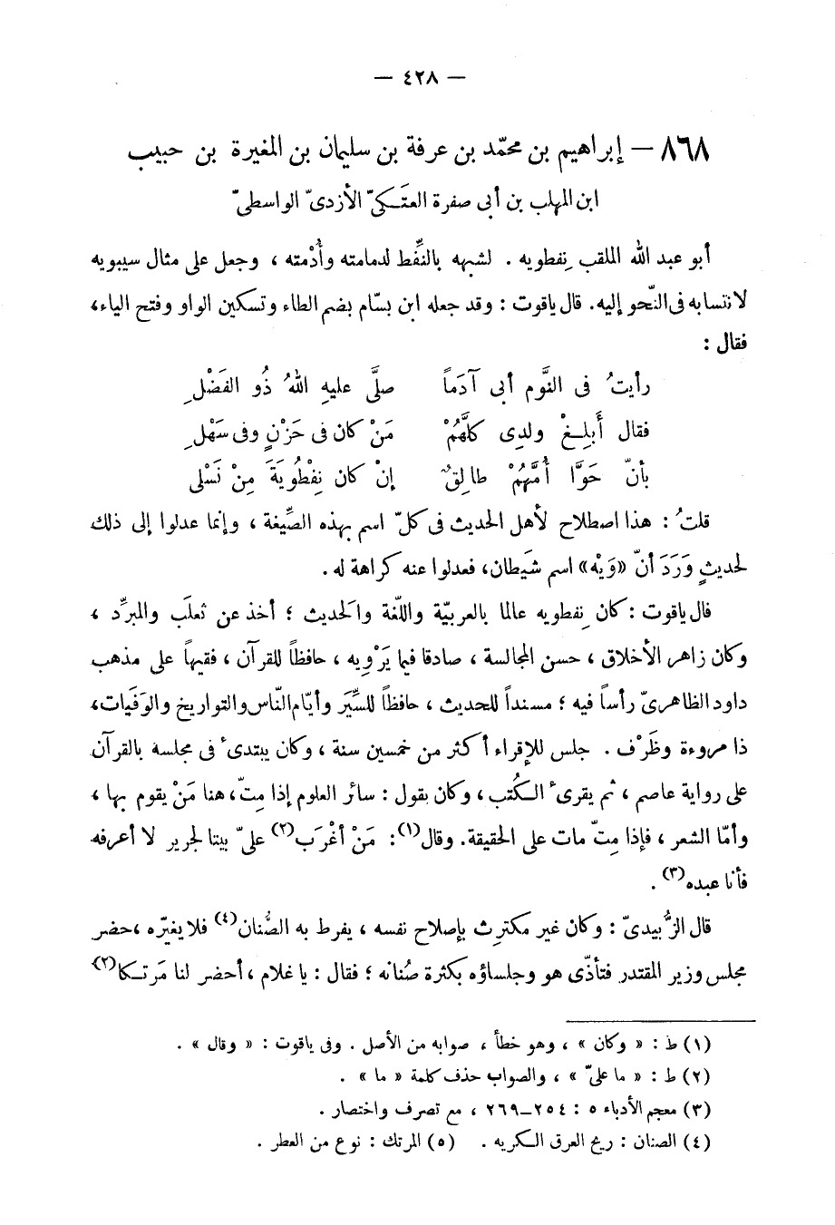 868 - إِبْرَاهِيم بن مُحَمَّد بن عَرَفَة بن سُلَيْمَان بن الْمُغيرَة بن حبيب ابْن الْمُهلب بن ابي صفرَة الْعَتكِي الْأَزْدِيّ الوَاسِطِيّ