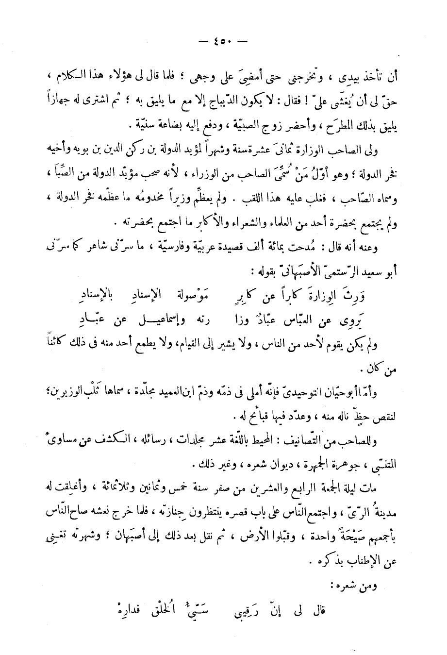 وَأما أَبُو حَيَّان التوحيدي فَإِنَّهُ أمْلى فِي ذمه وذم ابْن العميد مجلدة، سَمَّاهَا ثلب الوزيرين؛ لنَقص حَظّ ناله مِنْهُ، وَعدد فِيهَا قبائح لَهُ.