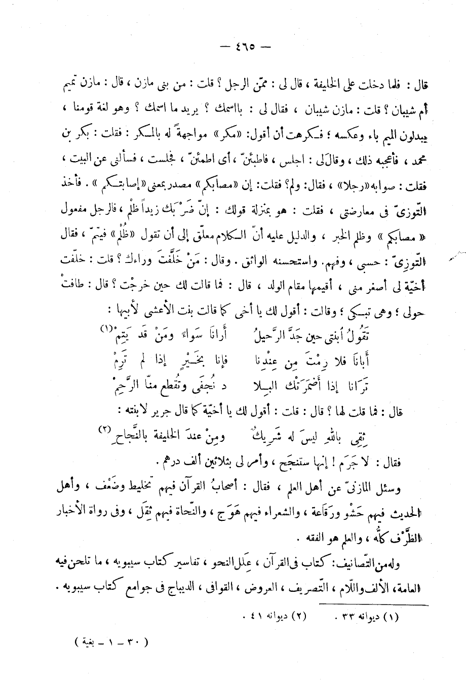 قَالَ: فَلَمَّا دخلت على الْخَلِيفَة، قَالَ لي: مِمَّن الرجل؟ قلت: من بني مَازِن، قَالَ: مَازِن تَمِيم أم شَيبَان؟ قلت: مَازِن شَيبَان، فَقَالَ لي: بااسمك؟ يُرِيد مَا اسْمك؟ وَهُوَ لُغَة قَومنَا، يبدلون الْمِيم بَاء وَعَكسه؛ فَكرِهت أَن أَقُول: " مكر: مُوَاجهَة لَهُ بالمكر، فَقلت: بكر بن مُحَمَّد، فأعجبه ذَلِك، وَقَالَ لي: اجْلِسْ، فاطبئن، أَي اطمئن، فَجَلَست، فَسَأَلَنِي عَن الْبَيْت، فَقلت: صَوَابه " رجلا "، فَقَالَ: وَلم؟ فَقلت: إِن " مصابكم " مصدر بِمَعْنى " إصابتكم ". فَأخذ التوزي فِي معارضتي، فَقلت: هُوَ بِمَنْزِلَة قَوْلك: إِن ضربك زيدا ظلم، فالرجل مفعول " مصابكم " وظلم الْخَبَر، وَالدَّلِيل عَلَيْهِ أَن الْكَلَام مُعَلّق إِلَى أَن تَقول " ظلم " فَيتم، فَقَالَ التوزي: حسبي، وَفهم. وَاسْتَحْسنهُ الواثق. وَقَالَ: من خلفت وَرَاءَك؟ قلت: خلفت أخية لي أَصْغَر مني، أقيمها مقَام الْوَلَد، قَالَ: فَمَا قَالَت لَك حِين خرجت؟ قَالَ: طافت حَولي؛ وَهِي تبْكي؛ وَقَالَت: أَقُول لَك يَا أخي كَمَا قَالَت بنت الْأَعْشَى لأَبِيهَا: