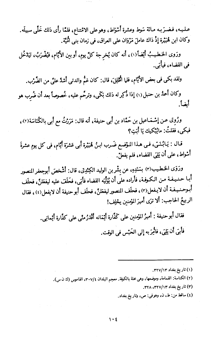 104 عليه، فضربه مائة سوط و عشرة أسواط، و هو على الامتناع، فلمّا رأى ذلك خلّى سبيله.