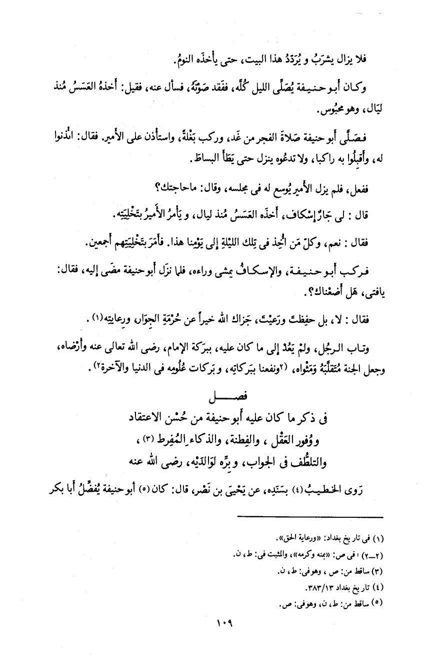 فصل فى ذكر ما كان عليه أبو حنيفة من حسن الاعتقاد و وفور العقل، و الفطنة، و الذكاء المفرط 3، و التلطّف فى الجواب، و برّه لوالديه، رضى اللّه عنه