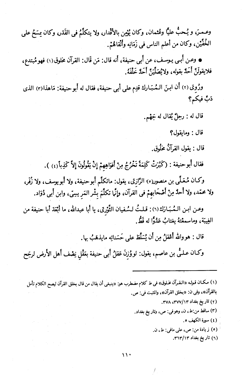 و كان معلّى بن منصور 5 الرّازىّ، يقول: ما تكلّم أبو حنيفة، و لا أبو يوسف، و لا زفر، و لا محمّد، و لا أحد من أصحابهم فى القرآن، و إنّما تكلّم بشر المريسىّ، و ابن أبى دواد.