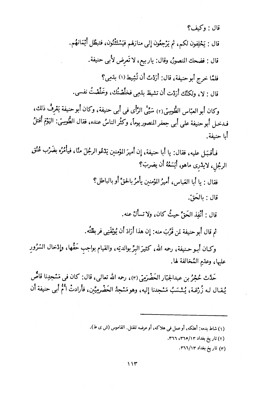 و كان أبو العبّاس الطّوسىّ 2 سيّئ الرّأى فى أبى حنيفة، و كان أبو حنيفة يعرف ذلك، فدخل أبو حنيفة على أبى جعفر المنصور يوما، و كثر الناس عنده، فقال الطّوسىّ: اليوم أقتل أبا حنيفة.