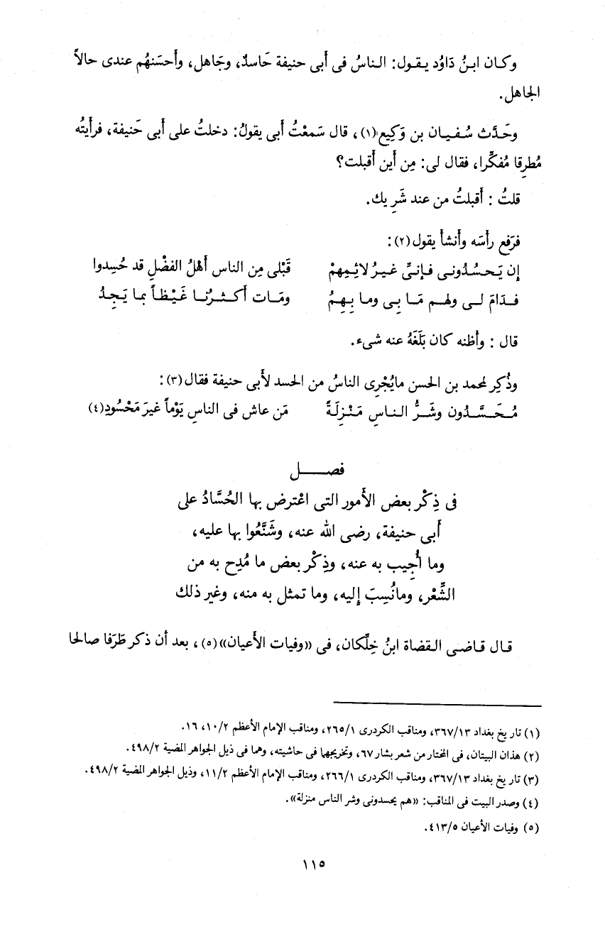 115 و كان ابن داود يقول: الناس فى أبى حنيفة حاسد، و جاهل، و أحسنهم عندى حالا الجاهل.
