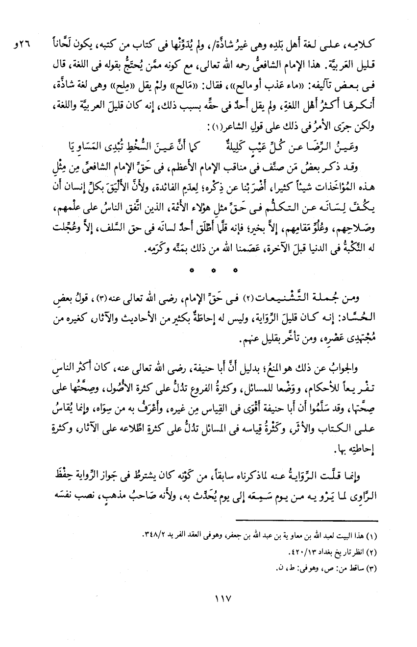 *** و من جملة التّشنيعات 2 فى حقّ الإمام، رضى اللّه تعالى عنه 3، قول بعض الحسّاد: إنه كان قليل الرّواية، و ليس له إحاطة بكثير من الأحاديث و الآثار، كغيره من مجتهدى عصره، و من تأخّر بقليل عنهم.