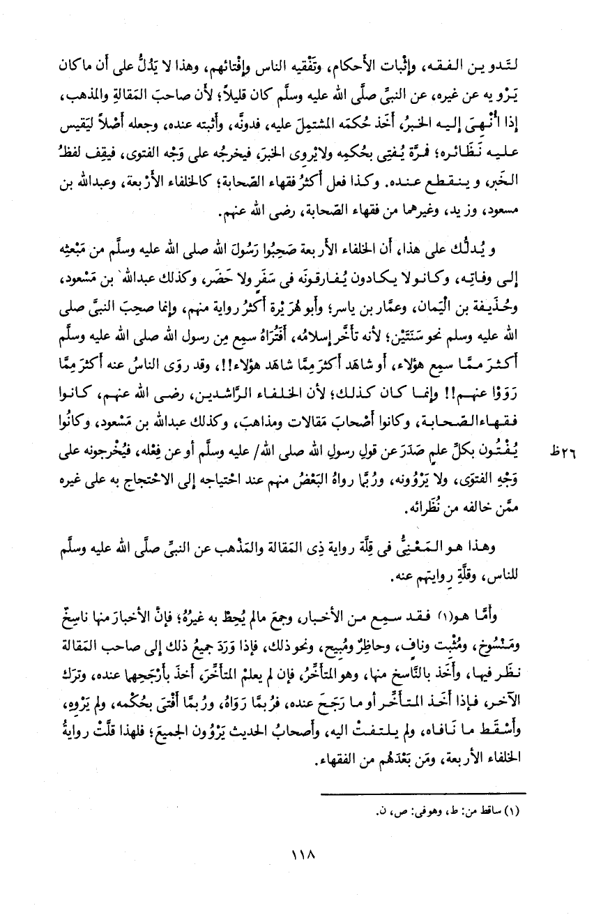 و يدلّك على هذا، أن الخلفاء الأربعة صحبوا رسول اللّه صلى اللّه عليه و سلّم من مبعثه إلى وفاته، و كانو لا يكادون يفارقونه فى سفر و لا حضر، و كذلك عبد اللّه بن مسعود، و حذيفة بن اليمان، و عمّار بن ياسر؛ و أبو هريرة أكثر رواية منهم، و إنما صحب النبىّ صلى اللّه عليه و سلم نحو سنتين؛ لأنه تأخّر إسلامه، أفتراه سمع من رسول اللّه صلى اللّه عليه و سلّم أكثر ممّا سمع هؤلاء، أو شاهد أكثر ممّا شاهد هؤلاء!!، و قد روى الناس عنه أكثر ممّا رووا عنهم!! و إنما كان كذلك؛ لأن الخلفاء الرّاشدين، رضى اللّه عنهم، كانوا فقهاء الصّحابة، و كانوا أصحاب مقالات و مذاهب، و كذلك عبد اللّه بن مسعود، و كانوا يفتون بكلّ علم صدر عن قول رسول اللّه صلى اللّه/عليه و سلّم أو عن فعله، فيخرجونه على وجه الفتوى، و لا يروونه، و ربّما رواه البعض منهم عند احتياجه إلى الاحتجاج به على غيره ممّن خالفه من نظرائه.