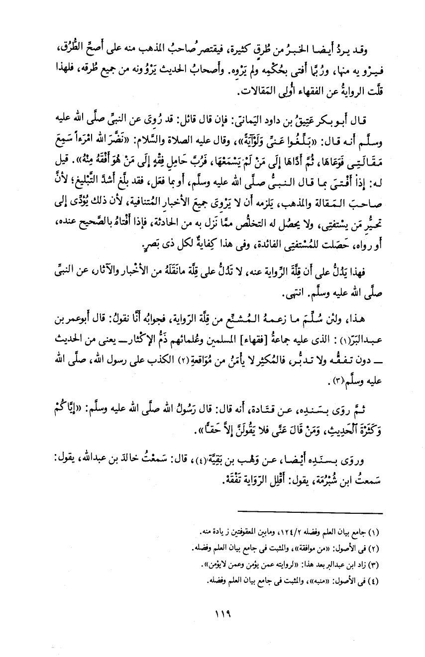 119 و قد يرد أيضا الخبر من طرق كثيرة، فيقتصر صاحب المذهب منه على أصحّ الطّرق، فيرويه منها، و ربّما أفتى بحكمه و لم يروه. و أصحاب الحديث يروونه من جميع طرقه، فلهذا قلّت الرواية عن الفقهاء أولى المقالات.