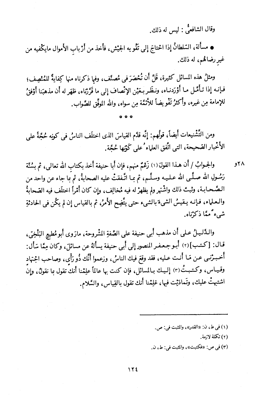 و الجواب/أن هذا القول 1 زعم منهم، فإن أبا حنيفة أخذ بكتاب اللّه تعالى، ثم بسنّة رسول اللّه صلّى اللّه عليه و سلّم، ثم بما اتّفقت عليه الصحابة، ثم بما جاء عن واحد من الصّحابة، و ثبت ذلك و اشتهر و لم يظهر له فيه مخالف، و إن كان أمرا اختلف فيه الصّحابة و العلماء فإنه يقيس الشاء بالشاء حتى يتّضح الأمر، ثم بالقياس إن لم يكن فى الحادثة شاء ممّا ذكرناه.