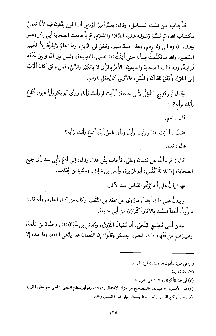 و عن أبى مطيع البلخىّ، أن سفيان الثّورىّ، و مقاتل بن حيّان 4، و حمّاد بن سلمة، و غيرهم من فقهاء ذلك العصر، اجتمعوا و قالوا: إن النّعمان هذا يدّعى الفقه، و ما عنده إلا
