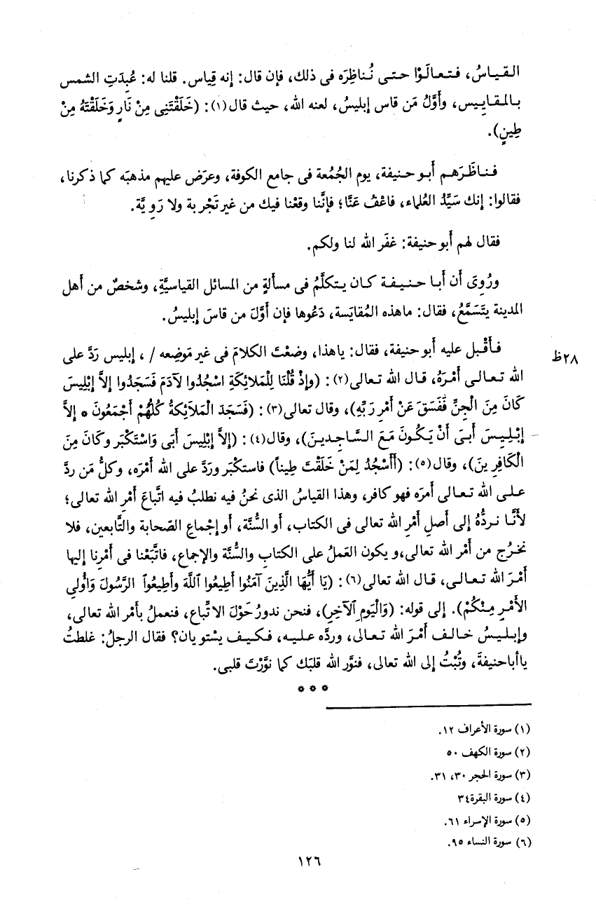 فأقبل عليه أبو حنيفة، فقال: يا هذا، وضعت الكلام فى غير موضعه/، إبليس ردّ على اللّه تعالى أمره، قال اللّه تعالى 2: (وَ إِذْ قُلْناا لِلْمَلاائِكَةِ اُسْجُدُوا لِآدَمَ فَسَجَدُوا إِلاّا إِبْلِيسَ كاانَ مِنَ اَلْجِنِّ فَفَسَقَ عَنْ أَمْرِ رَبِّهِ)، و قال تعالى 3: (فَسَجَدَ اَلْمَلاائِكَةُ كُلُّهُمْ أَجْمَعُونَ* إِلاّا إِبْلِيسَ أَبى أَنْ يَكُونَ مَعَ اَلسّااجِدِينَ)، و قال 4: (إِلاّا إِبْلِيسَ أَبى وَ اِسْتَكْبَرَ وَ كاانَ مِنَ اَلْكاافِرِينَ)، و قال 5: (أَ أَسْجُدُ لِمَنْ خَلَقْتَ طِيناً) فاستكبر و ردّ على اللّه أمره، و كلّ من ردّ على اللّه تعالى أمره فهو كافر، و هذا القياس الذى نحن فيه نطلب فيه اتّباع أمر اللّه تعالى؛ لأنّا نردّه إلى أصل أمر اللّه تعالى فى الكتاب، أو السّنّة، أو إجماع الصّحابة و التّابعين، فلا نخرج من أمر اللّه تعالى، و يكون العمل على الكتاب و السّنّة و الإجماع، فاتّبعنا فى أمرنا إليها أمر اللّه تعالى، قال اللّه تعالى 6: (ياا أَيُّهَا اَلَّذِينَ آمَنُوا أَطِيعُوا اَللّاهَ وَ أَطِيعُوا اَلرَّسُولَ وَ أُولِي اَلْأَمْرِ مِنْكُمْ). إلى قوله: (وَ اَلْيَوْمِ اَلْآخِرِ)، فنحن ندور حول الاتّباع، فنعمل بأمر اللّه تعالى، و إبليس خالف أمر اللّه تعالى، و ردّه عليه، فكيف يستويان؟ فقال الرجل: غلطت يا أبا حنيفة، و تبعت إلى اللّه تعالى، فنوّر اللّه قلبك كما نوّرت قلبى.