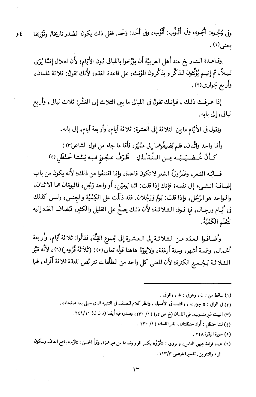 و أضافوا العدد من الثلاثة إلى العشرة إلى جموع القلّة، فقالوا: ثلاثة أيّام، و أربعة أحمال، و خمسة أشهر، و ستة أرغفة، و لا يورد هاهنا قوله تعالى 5: (ثَلااثَةَ قُرُوءٍ) 6، لأنّه ميّز الثلاثة بجمع الكثرة؛ لأن المعنى كل واحد من المطلّقات تتربّص للعدّة ثلاثة أقراء، فلما