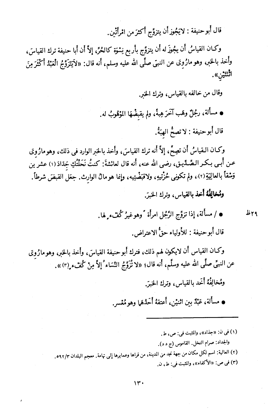 130 قال أبو حنيفة: لا يجوز أن يتزوّج أكثر من امرأتين.